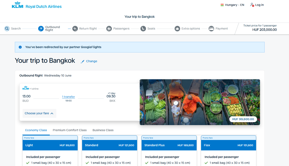 Výhodné spiatočné letenky z Budapešti do Bangkoku ponúka spoločnosť KLM za 203 000 hufov.