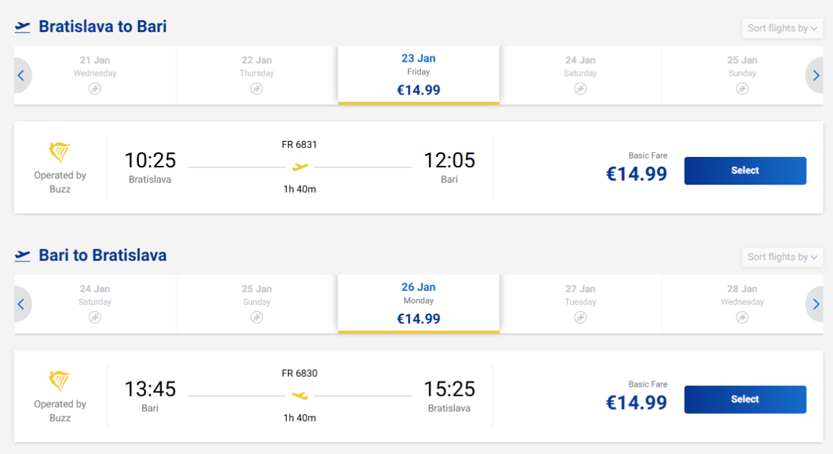 Z Bratislavy do Bari si môžete kúpiť spiatočné letenky so spoločnosťou Ryanair v zimných mesiacoch od 30 eur. Mesto ponúka príjemnú atmosféru, historické uličky a skvelú kuchyňu a je dobrým východiskovým bodom na cestovanie po Apúlii.