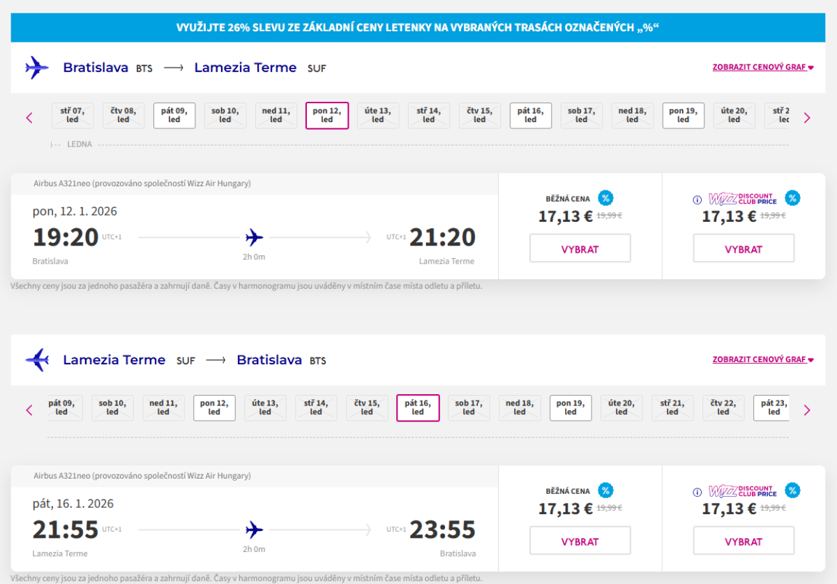 Lety sú v pondelok a piatok. Odlet z Bratislavy je o 19:20, spiatočný let z Lamezia Terme odlieta o 21:55.