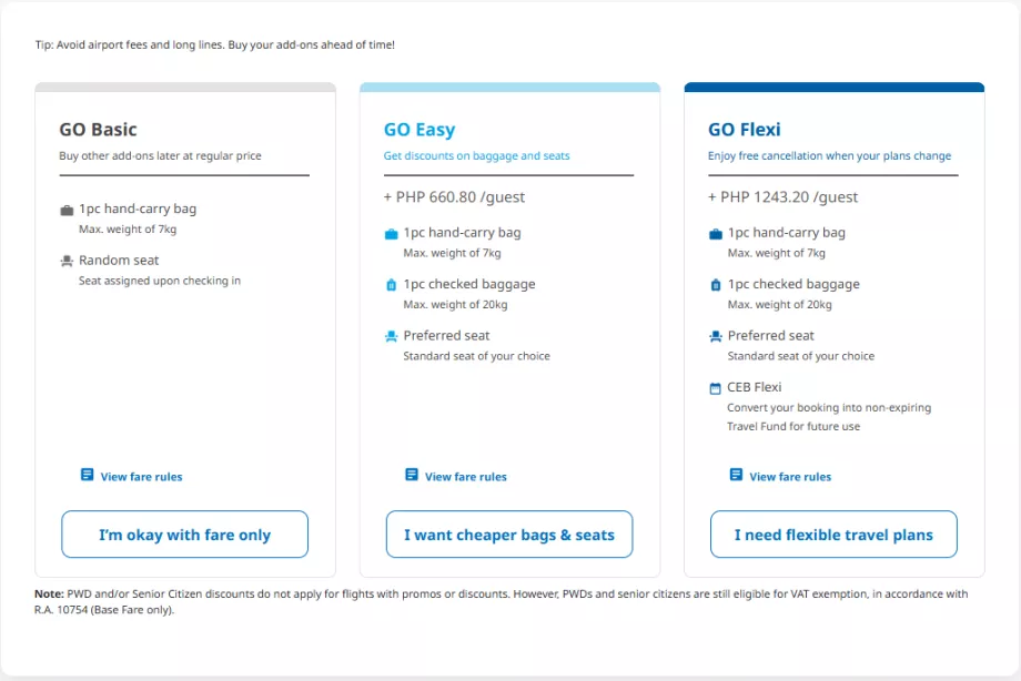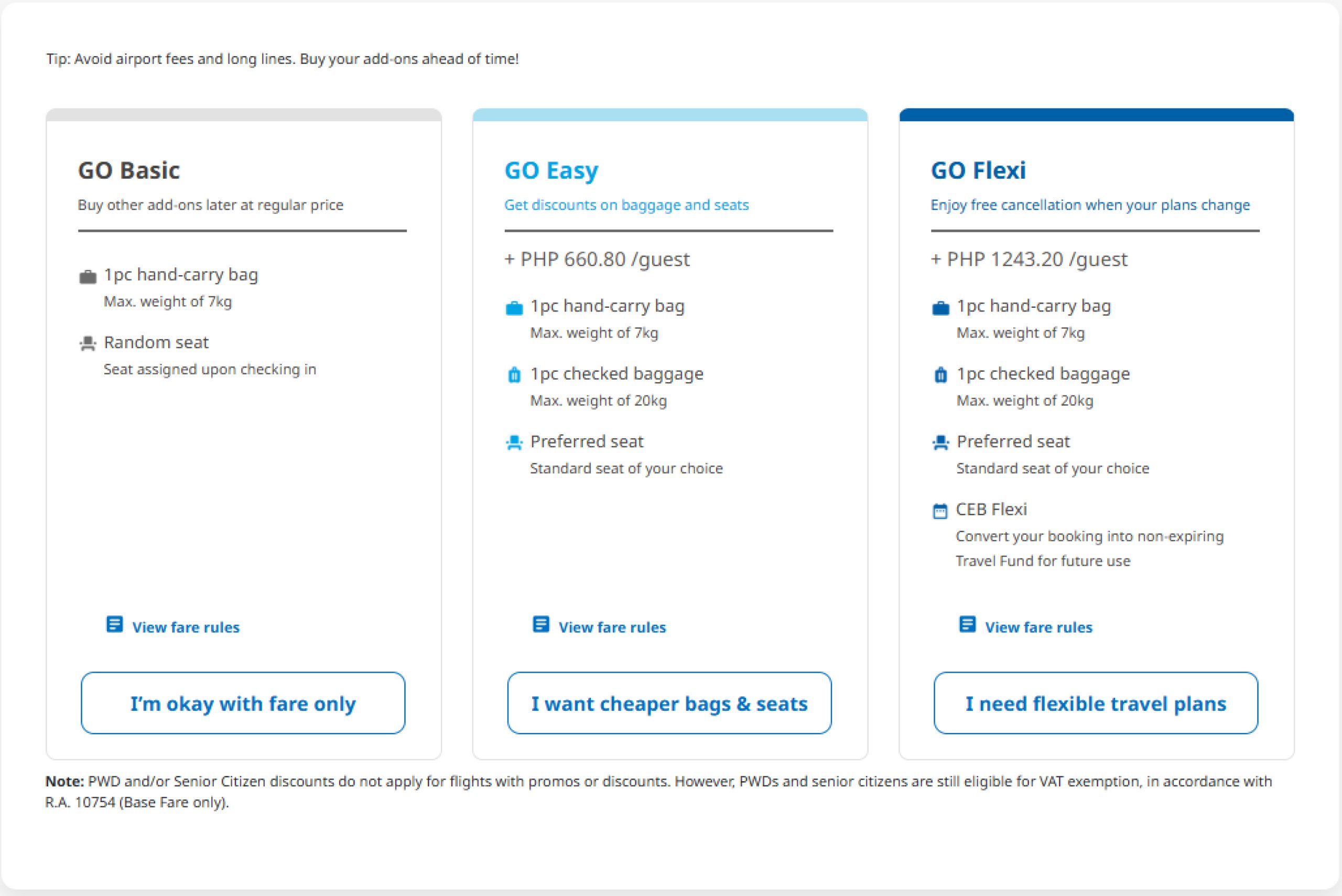 - GO Flexi - Bezplatná zapísaná batožina (20 kg) a príručná batožina, bezplatný výber sedadla, bezplatné zrušenie rezervácie (peniaze budú vrátené ako kredit na budúce použitie so spoločnosťou Cebu Pacific