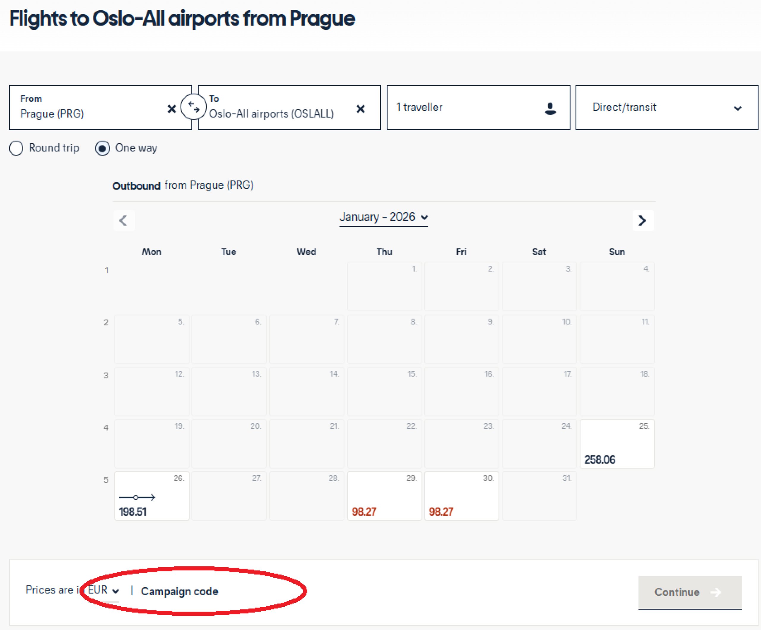 - 💡 Tip: Ak máte od 12 do 25 rokov, použite promo kód UNDER26 na lety po Škandinávii. Získate špeciálne jednosmerné letenky, často so zľavou 20 %. Promo kód zadáte do políčka "Kód kampane", keď sa vám zobrazí kalendár lacných letov, pozri obrázky nižšie.