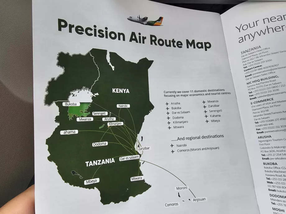 Precision Air je sieťová letecká spoločnosť, ktorá ponúka lety s prestupom cez letiská Dar es Salaam DAR alebo Kilimandžáro JRO alebo Zanzibar ZNZ.