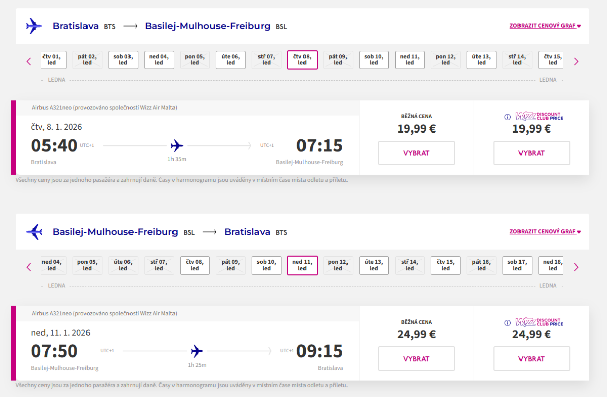 Wizz Air ponúka od januára do marca veľa termínov z Bratislavy do Bazileja . Cena spiatočnej letenky je 45 eur. Ideálne aj na predĺžený víkend od štvrtka do nedele.