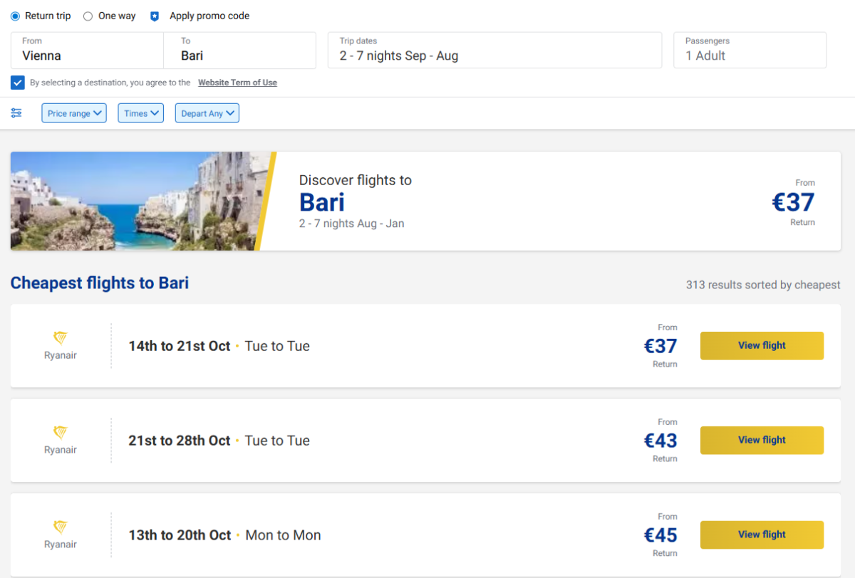 Využite výhodné ceny letov do Bari, Taliansko od spoločnosti Ryanair.