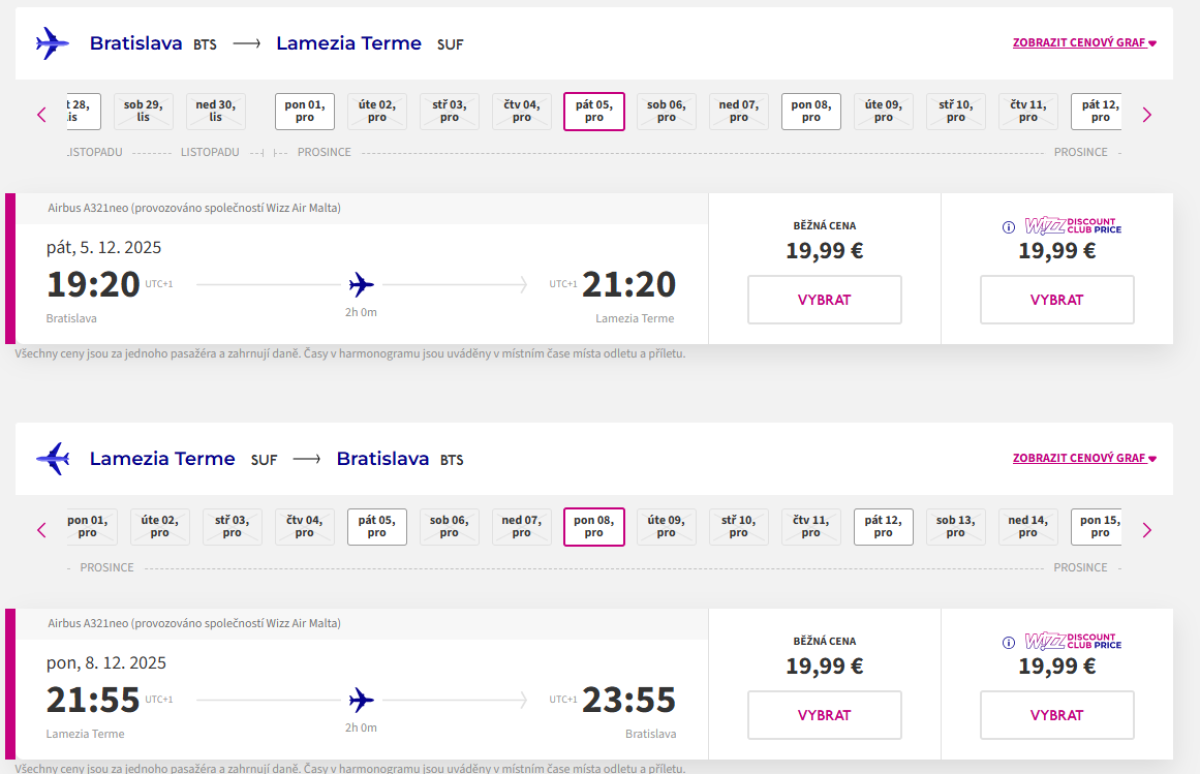Termíny od piatka do pondelka sú ideálne na predĺžený víkend - s odchodom z Bratislavy o 19:20 a návratom z Lamezia Terme o 21:55