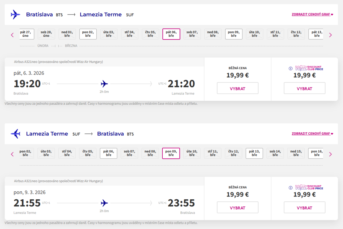 V ponuke sú termíny od piatka do pondelka s odletom z Bratislavy o 19:20 a návratom z Lamezia Terme o 21:55.