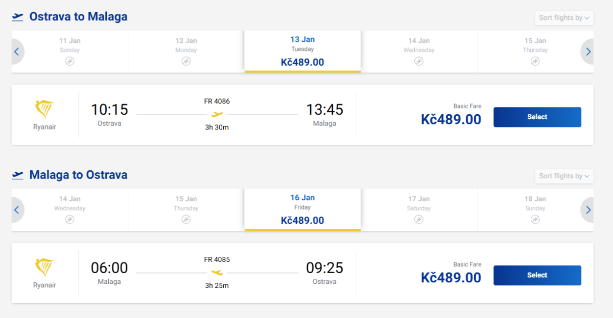 Ryanair ponúka v januári spiatočné lety z Ostravy do Málagy, a to na kratšie pobyty aj na týždenné termíny. Napríklad: