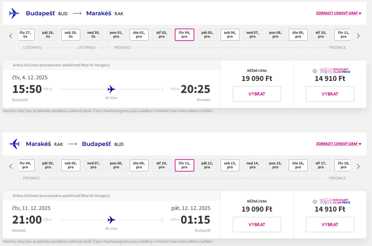 Od novembra do februára ponúka Wizz Air spiatočné letenky z Budapešti do Marrákeša za 38 180 huf.
