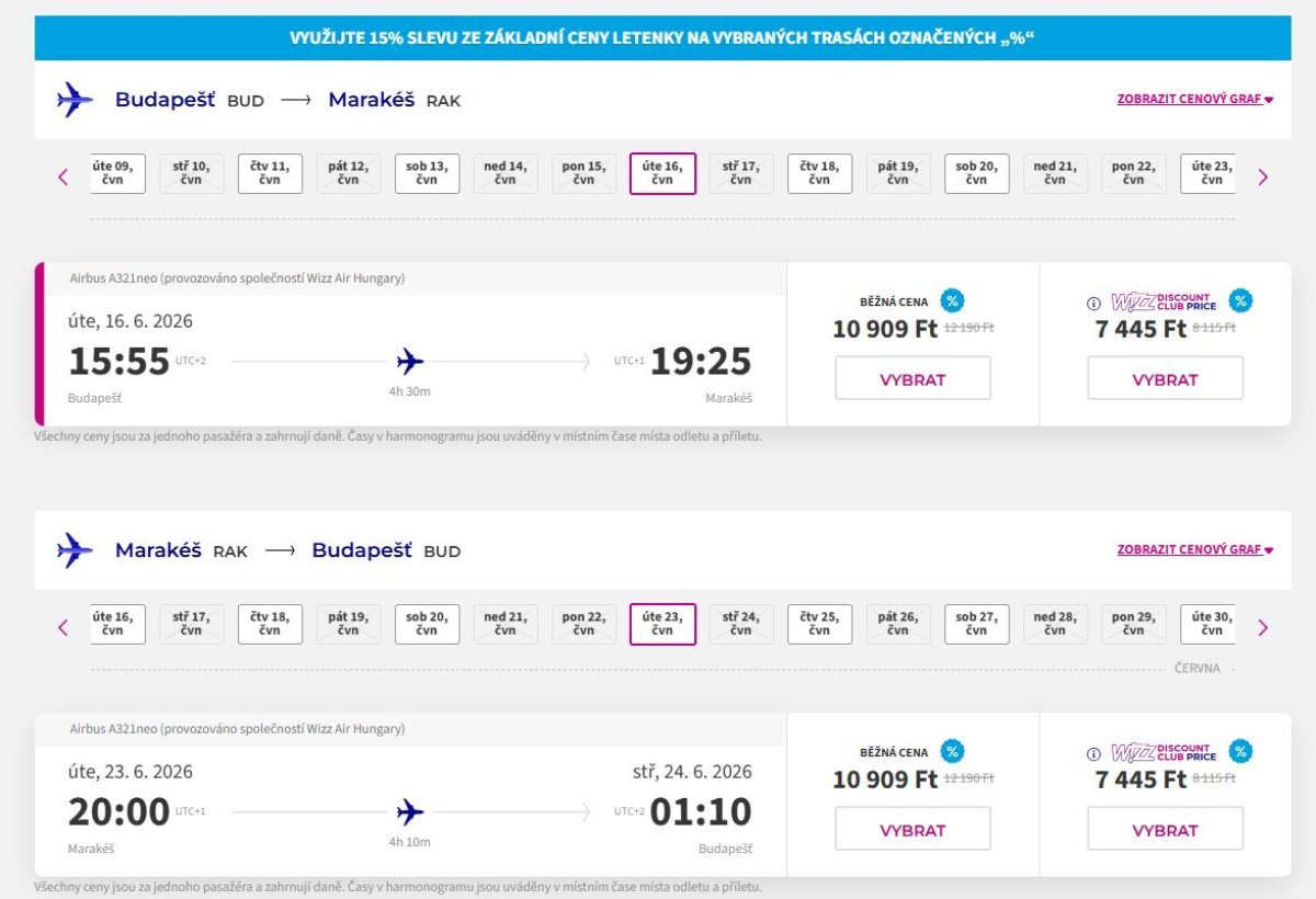 Nízkonákladová letecká spoločnosť Wizz Air ponúka lacné spiatočné letenky z Budapešti do Marrákeša. Ceny začínajú na 21 818 huf, členovia WDC si môžu kúpiť letenky za 14 890 huf.