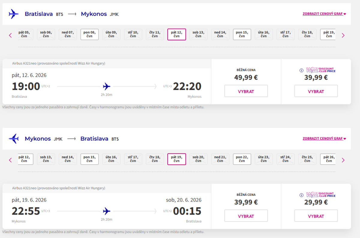 - Bratislava - Mykonos: 19:00-22:20