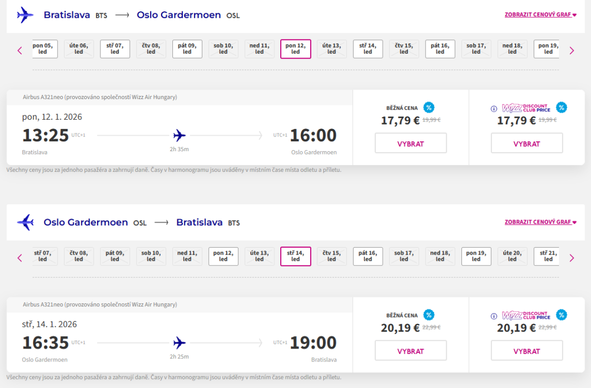 V ponuke sú krátke intervaly vhodné na rýchly výlet, napríklad pondelok-streda alebo streda-piatok s odletom z Bratislavy o 13:25 a návratom z Osla o 16:35.