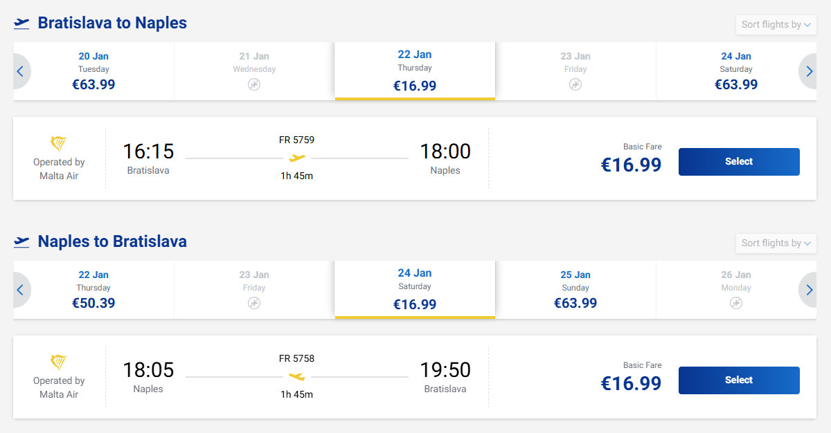 Výhodou sú aj príjemné letové časy - odlet z Bratislavy je o 16:15 a návrat z Neapola o 18:05.