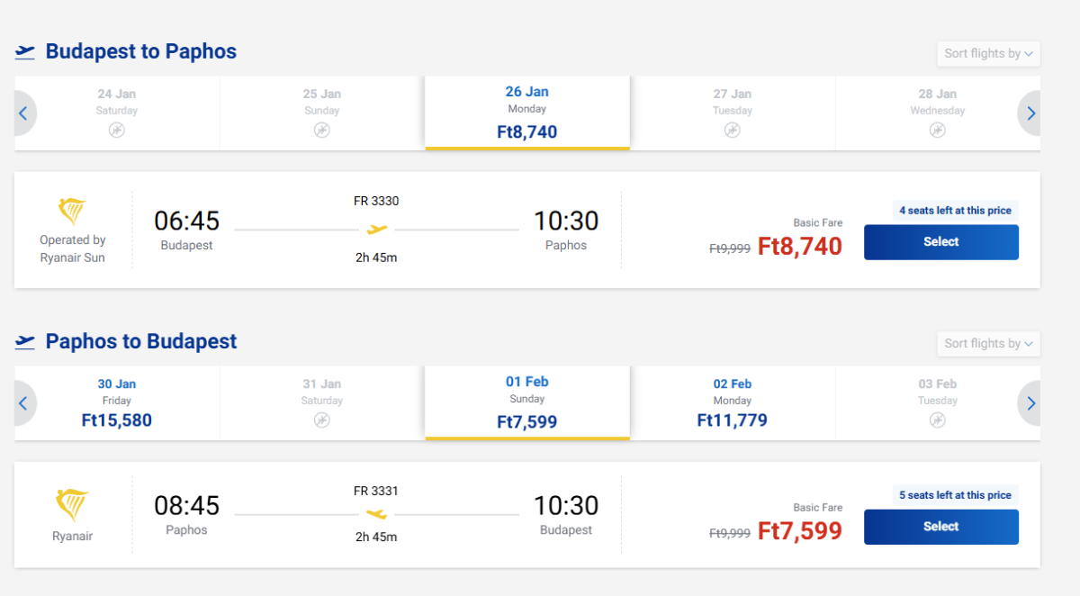 Nízkonákladová letecká spoločnosť Ryanair ponúka počas zimy spiatočné lety z Budapešti do Pafosu za rozumné ceny. Najlacnejšie termíny sú najmä vo februári, ale dobré ceny okolo 24 000 huf sa objavujú aj v januári alebo začiatkom marca.