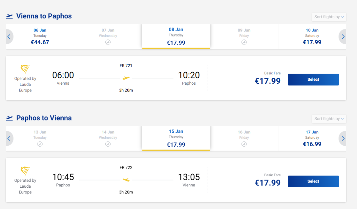 Nízkonákladová letecká spoločnosť Ryanair ponúka spiatočné lety z Viedne do Pafosu na január za 34 eur.