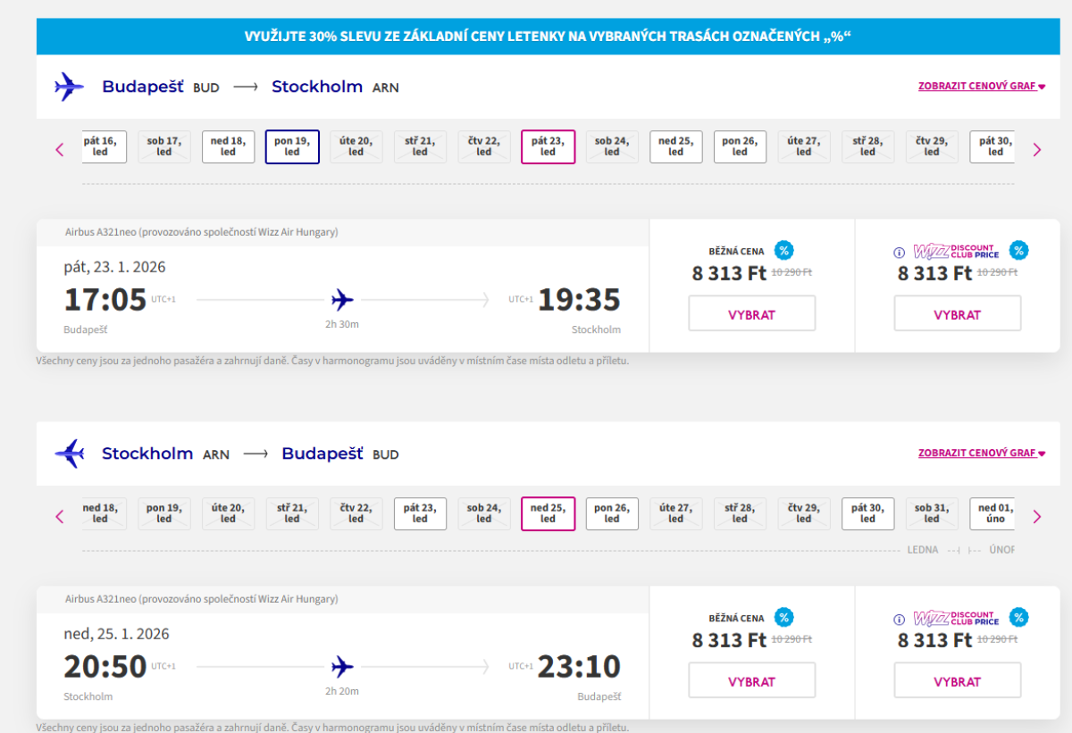 Odlet z Budapešti je v piatok o 17:05 a návrat zo Štokholmu v nedeľu o 20:50.