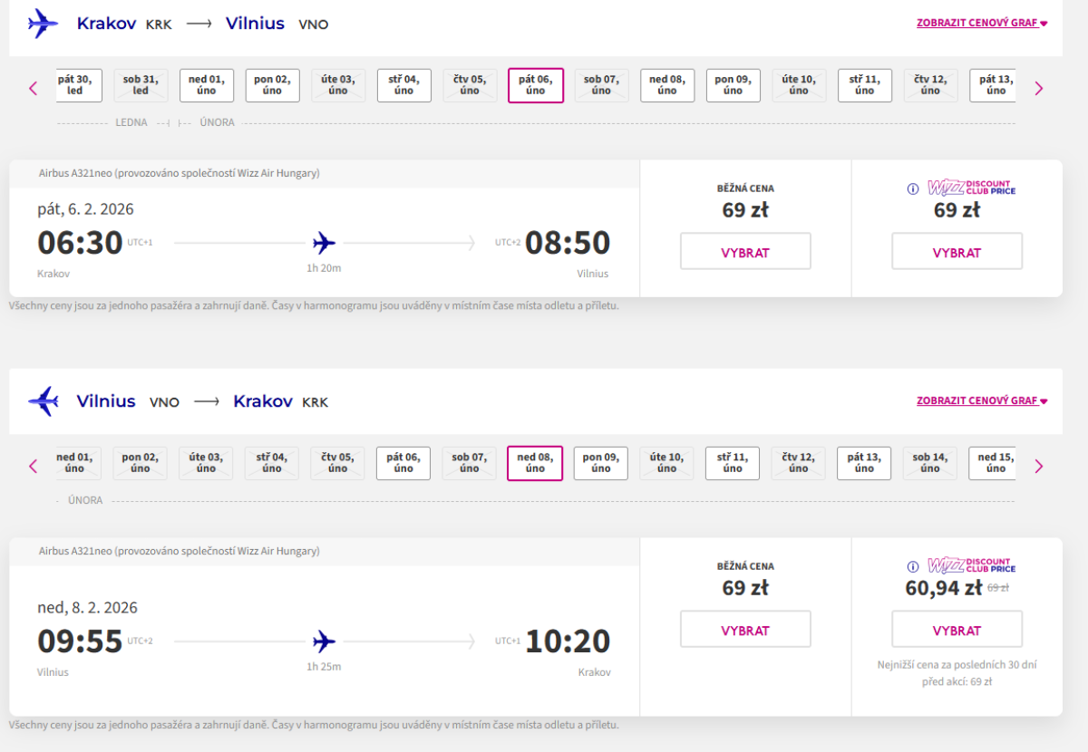 Spiatočné letenky z Krakova do Vilniusu so spoločnosťou Wizz Air za 138 PLN, s WDC za 122 PLN.