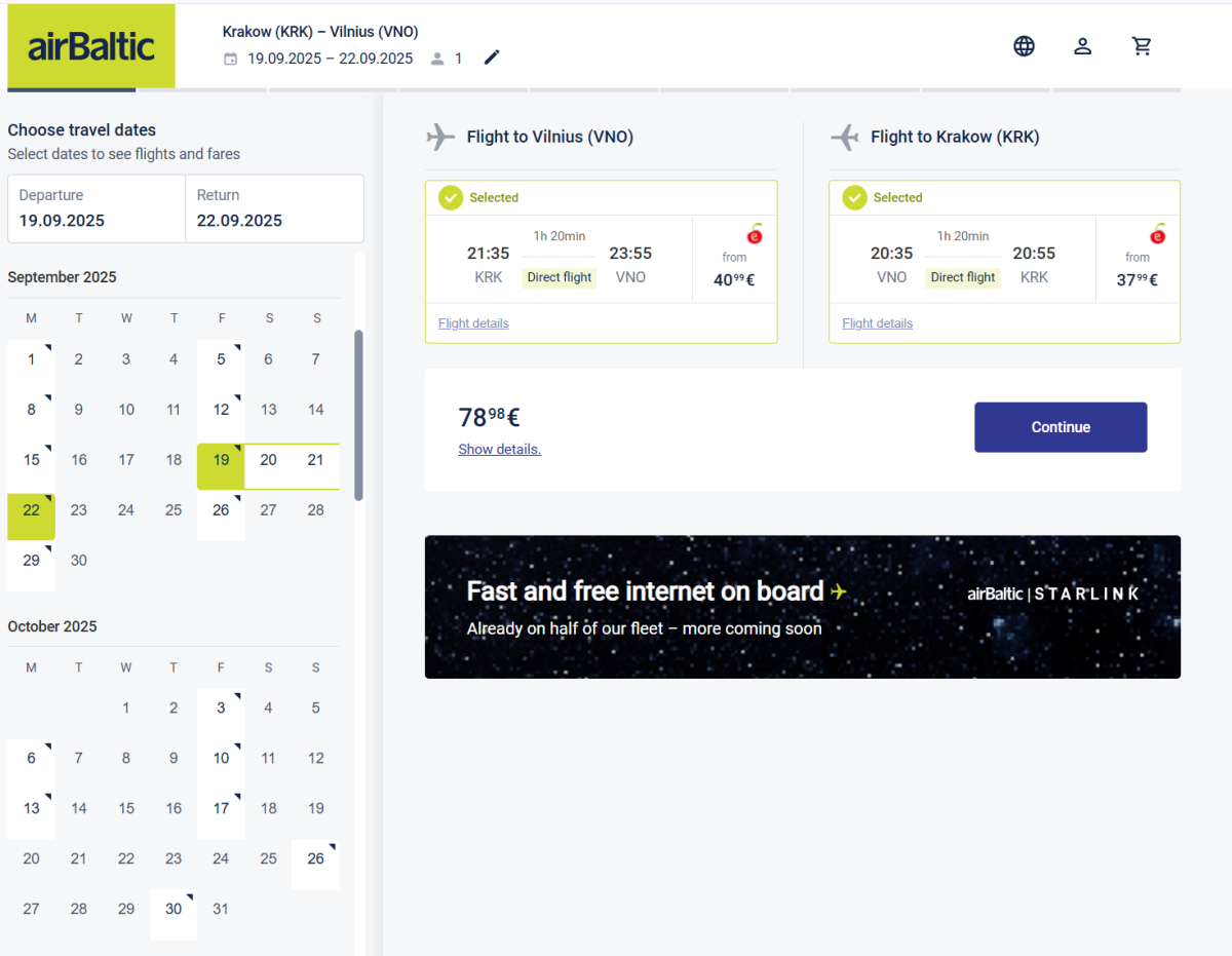 Najtańsza oferta to bezpośrednie loty z Krakowa do Wilna już od 78,98 euro, idealnie na długie weekendy od czwartku do niedzieli z wieczornymi lotami.