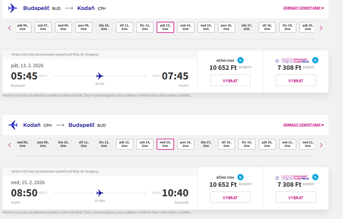 K dispozícii je veľa termínov a lety sú dostupné každý deň okrem utorka. Spiatočné letenky sú k dispozícii za 21 304 huf, členovia Wizz Discount Clubu ich môžu získať dokonca za 14 616 huf.