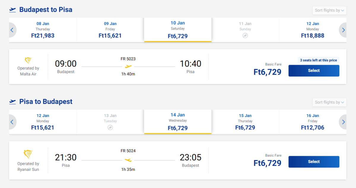 Odlet z Budapešti je o 9:00, návrat z Pisy o 21:30.