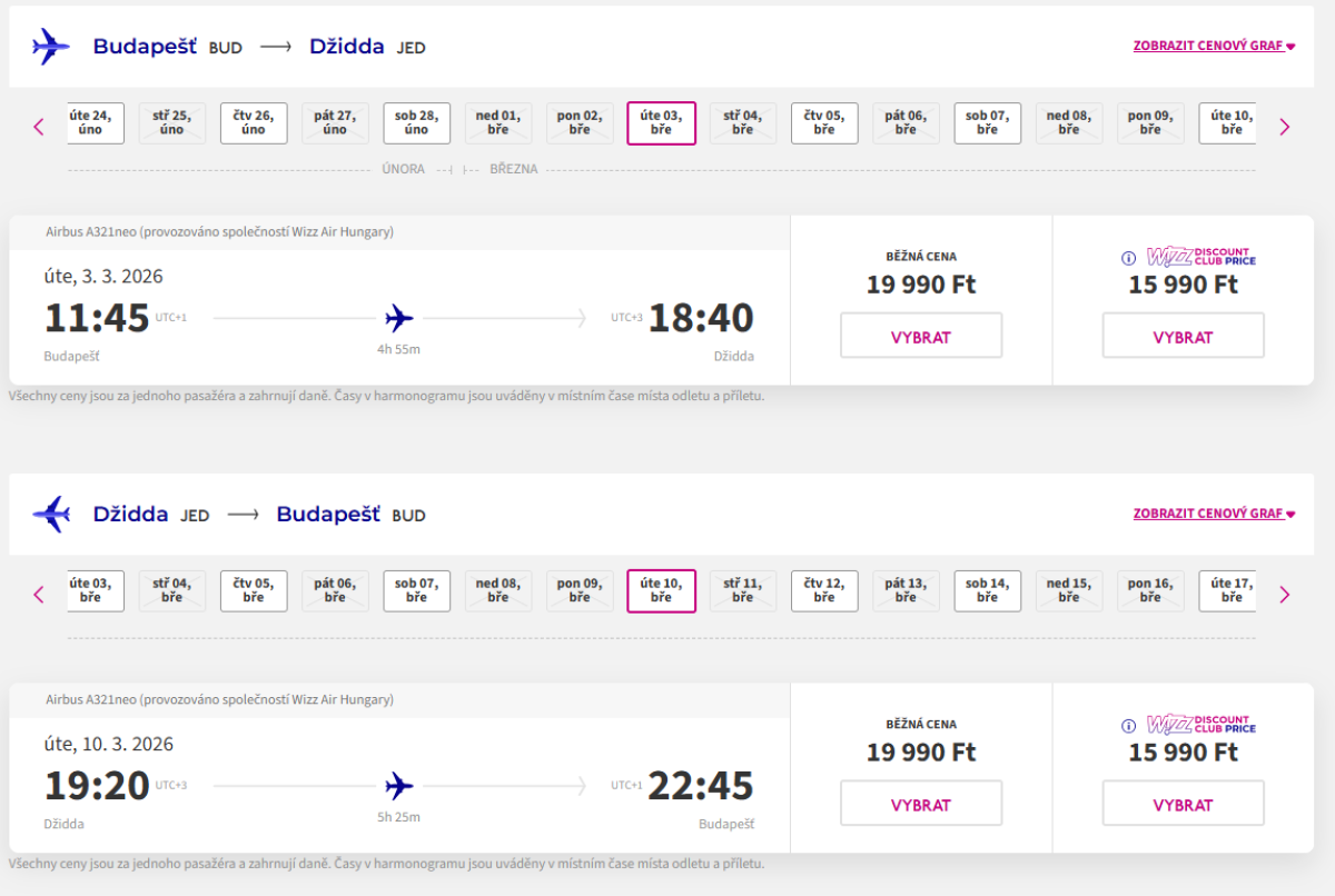 Spoločnosť Wizz Air ponúka spiatočné letenky z Budapešti do Džiddy za 39 980 hufov alebo pre členov WDC za 31 980 hufov.