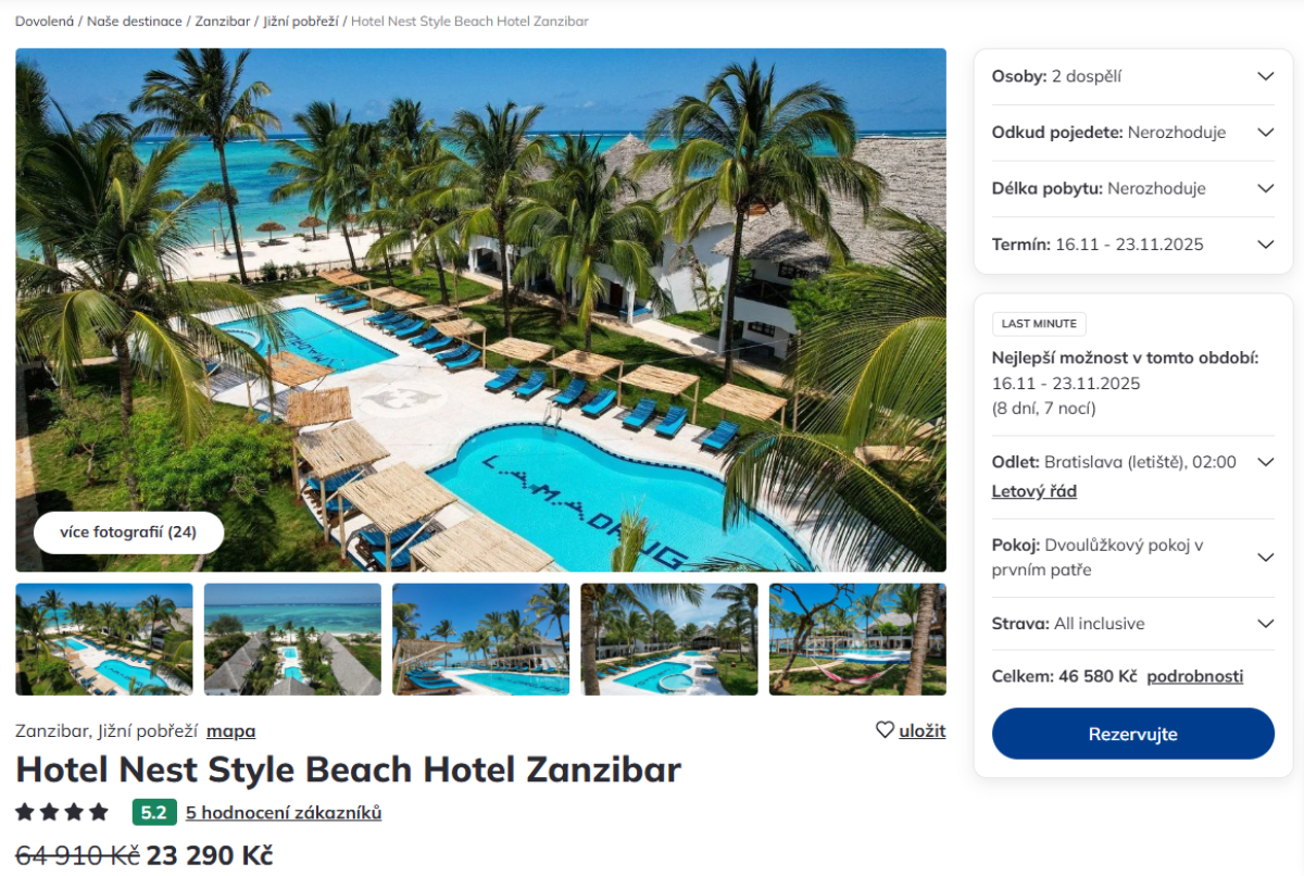 Najlepšou ponukou je pobyt v 4* hoteli Nest Style Beach Zanzibar s all inclusive za 959 eur.