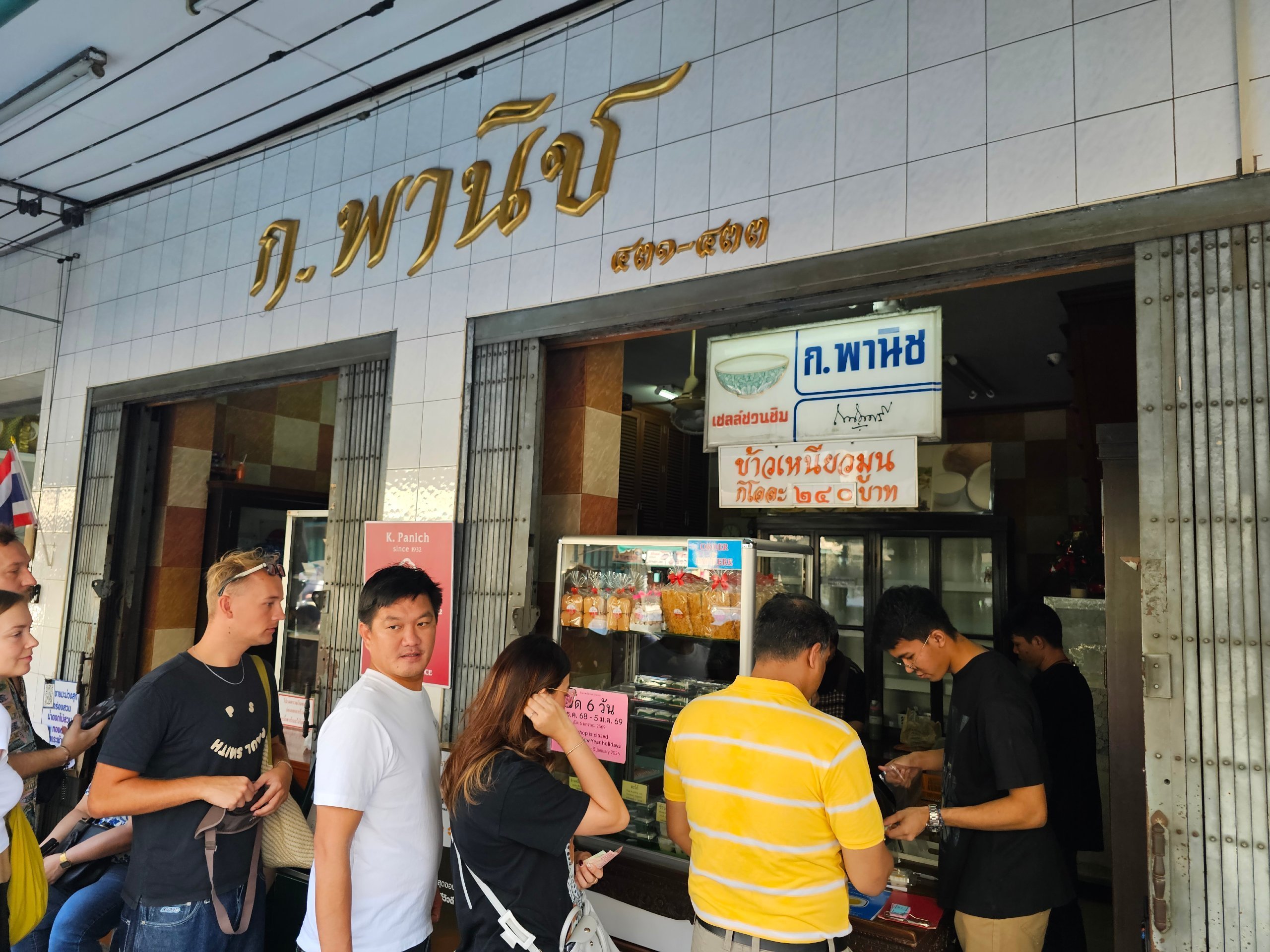Bistro má okno do ulice a malú miestnosť na sedenie. Bolo tam práve rušno, takže sme si mango sticky rice a tradičný thajský puding zjedli na vedľajšom chodníku.