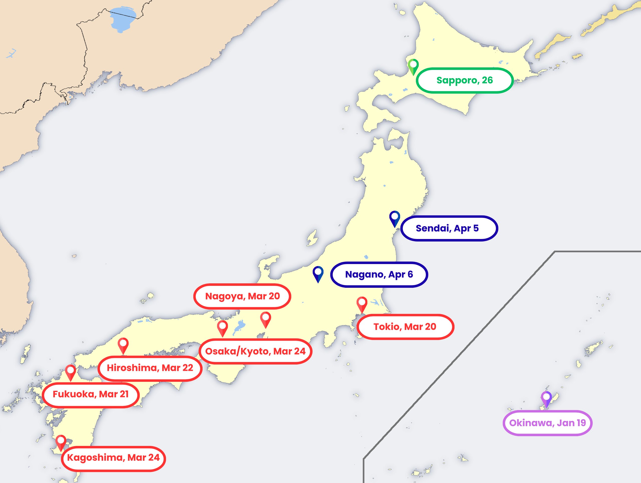 Podľa Japonského meteorologického inštitútu sa v roku 2026 očakávajú nasledujúce termíny kvitnutia sakúr.
