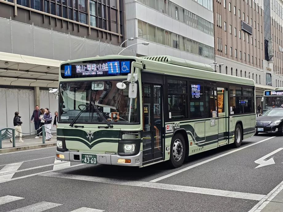 Krémové autobusy s červeným pruhom premávajú zo stanice Kjóto do oblastí ako Arashiyama alebo naopak na severovýchod smerom na Iwakura a Ohara.