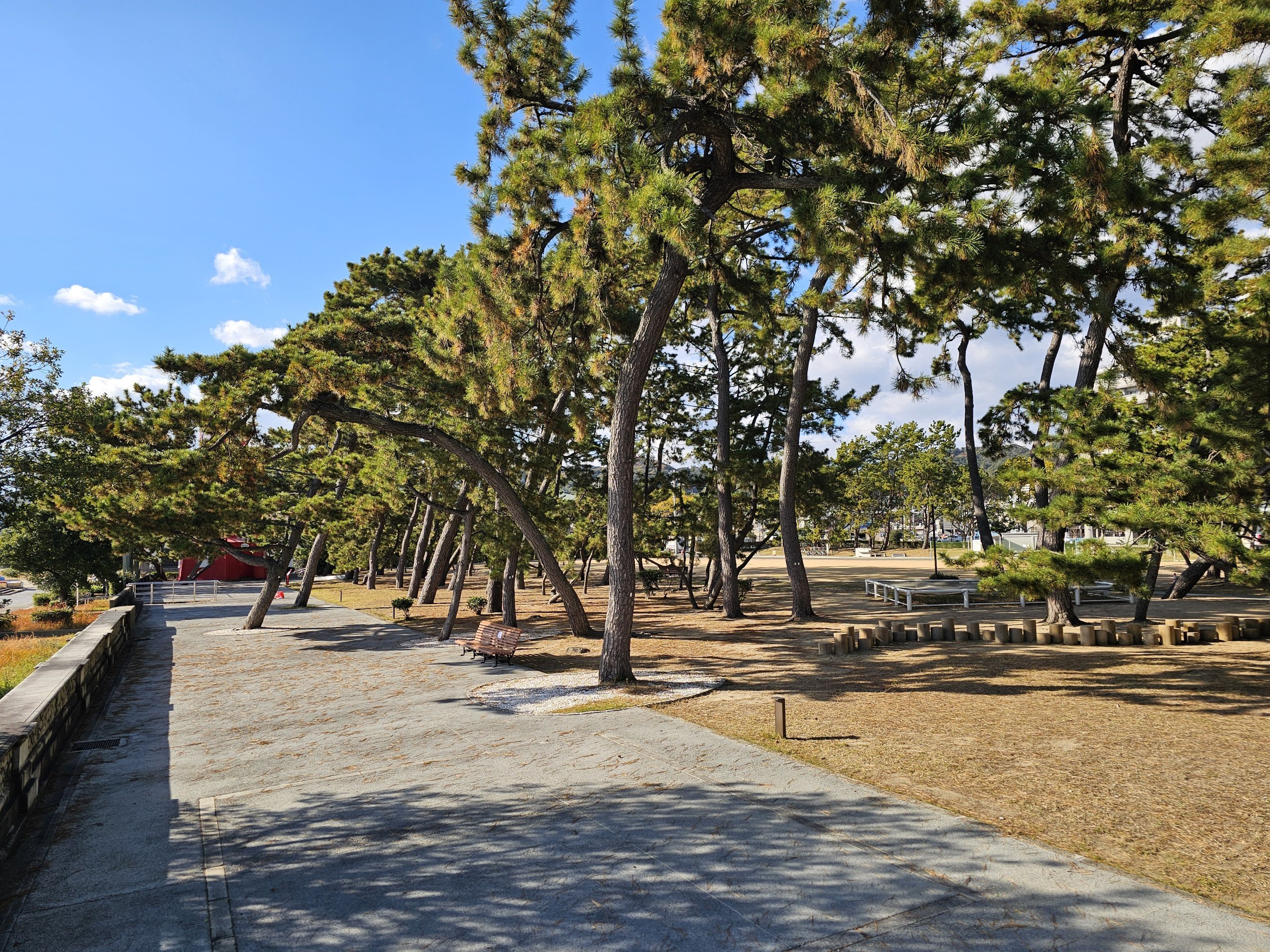 Na druhej strane je tu dostatok miesta, pekný výhľad na pobrežie a pri dobrej viditeľnosti aj na most Akashi Kaikyō.