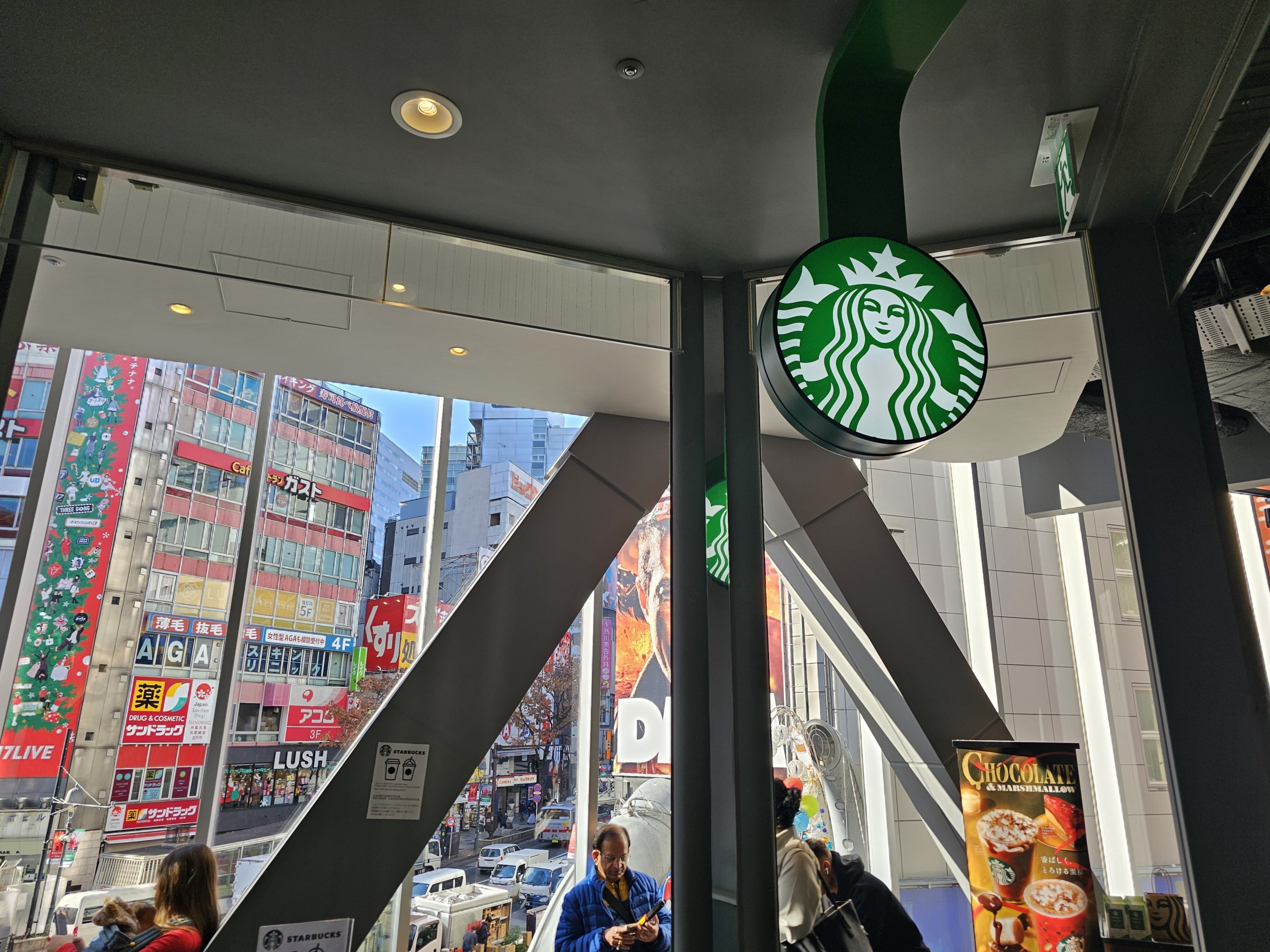 Má pekný výhľad na križovatku Shibuya, aj keď nie taký dokonalý ako Share Lounge, pretože mu mierne bráni strešná konštrukcia.