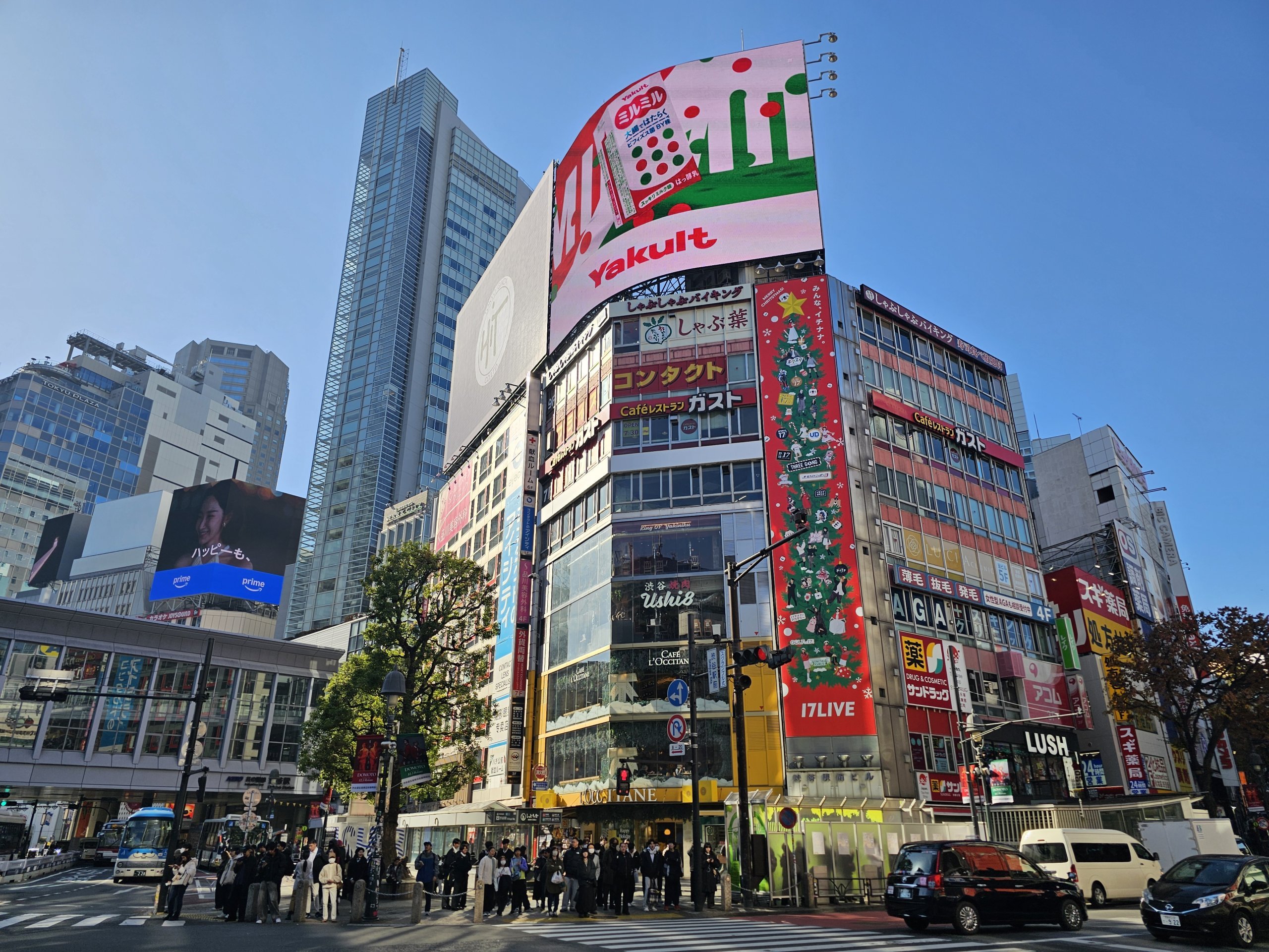 Ulice severne od križovatky sú rušné pešie zóny lemované reštauráciami, obchodmi a domami pokrytými neónovými nápismi.