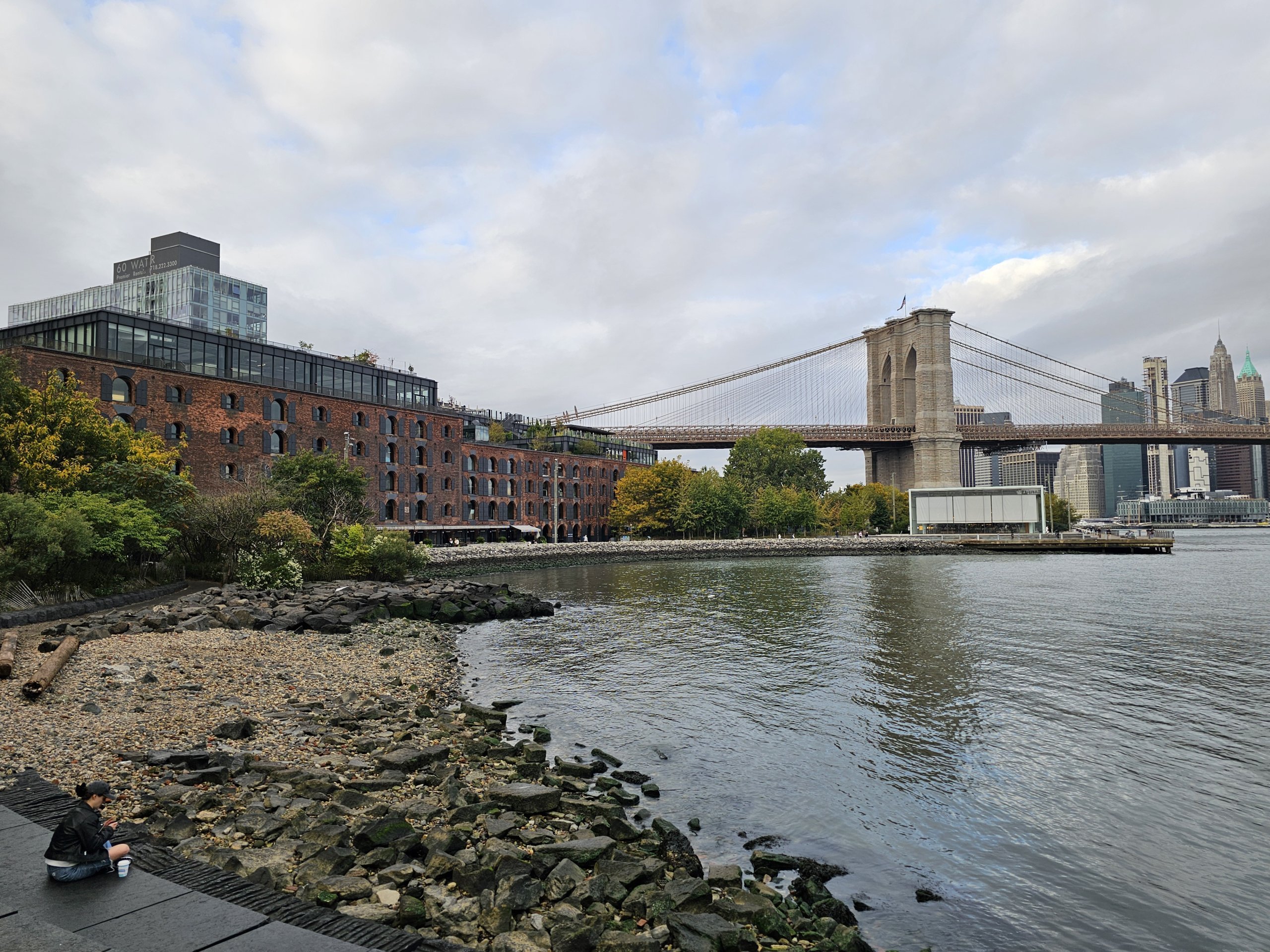 Z nábrežia rieky môžete vidieť manhattanský aj brooklynský most a panorámu Manhattanu v pozadí.