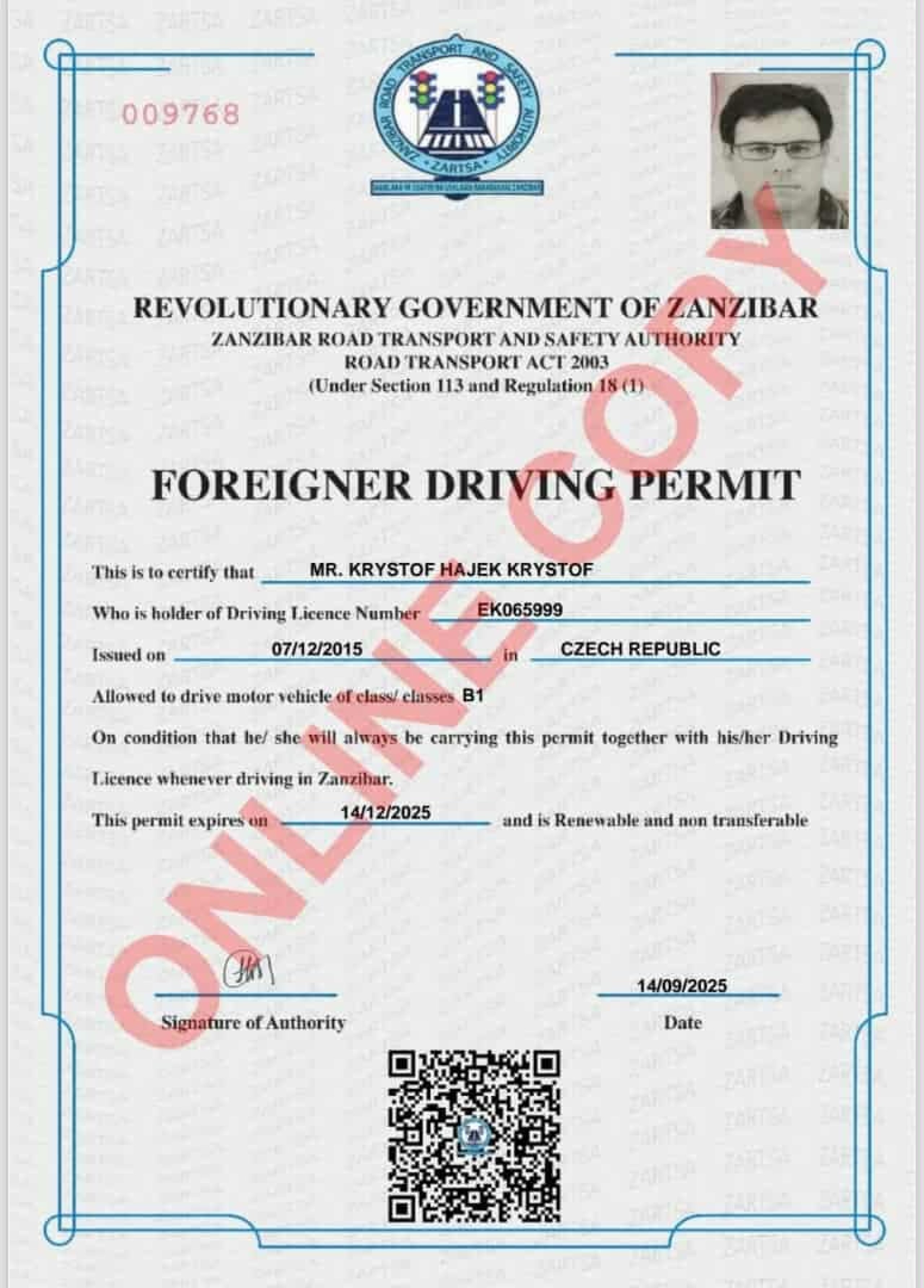 Pri kontrole musíte predložiť národný vodičský preukaz a miestne zanzibarské povolenie, ktoré stačí ukázať na mobilnom telefóne.