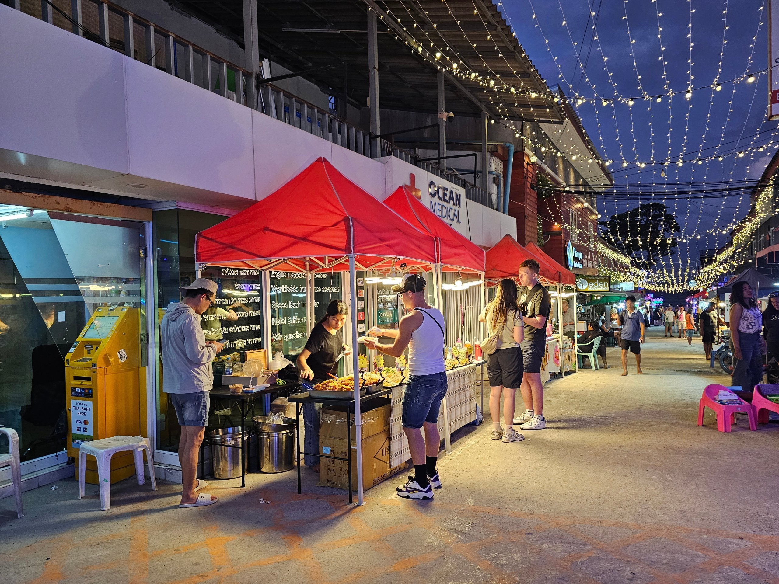 Pozdĺž pláže sa nachádza množstvo stánkov s jedlom a nápojmi a kaviarní aj mimo Full Moon Party.