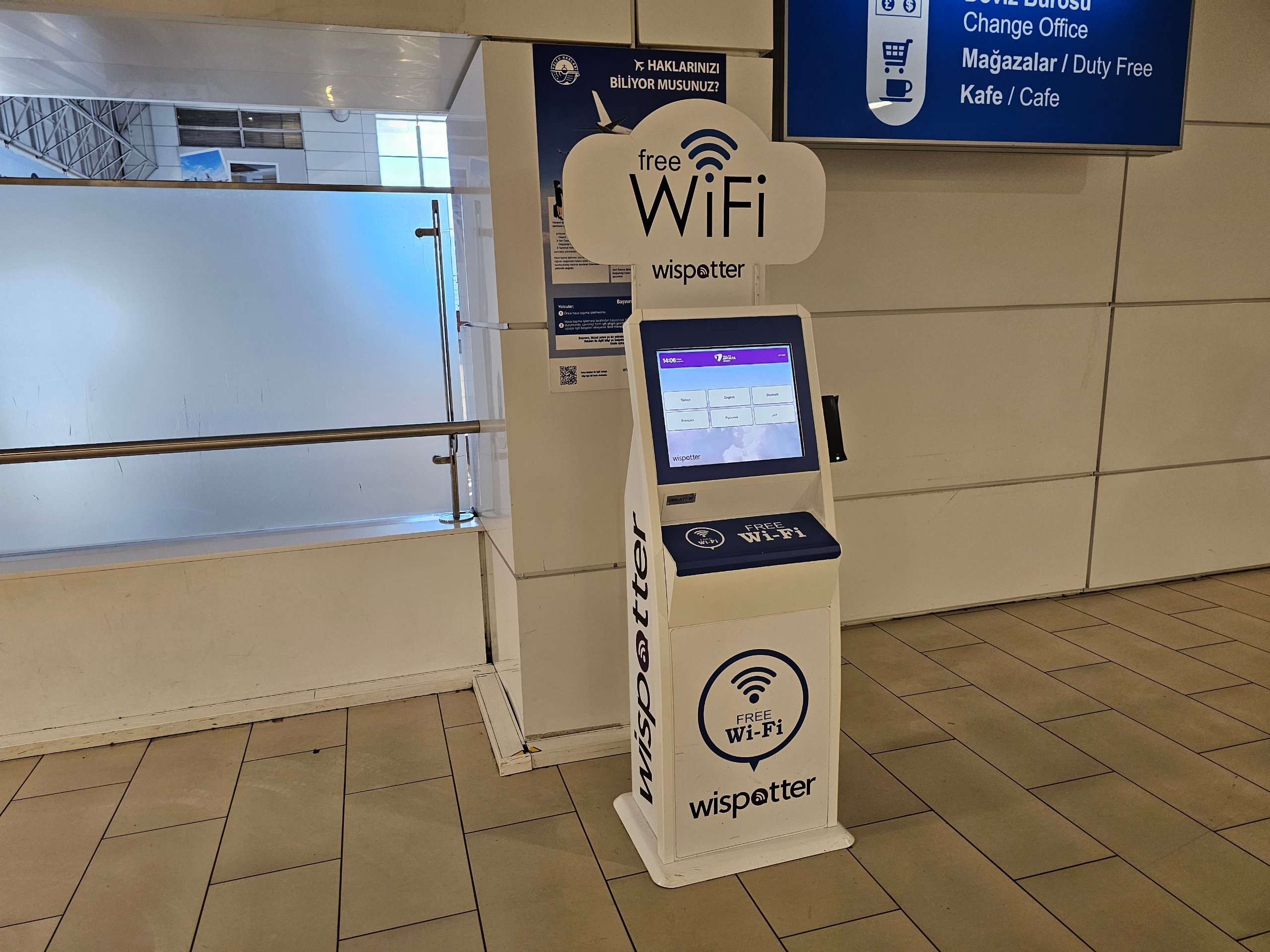 Bezplatné Wi-Fi je k dispozícii len 60 minút. Heslo môžete získať len v oficiálnych kioskoch rozmiestnených po celom letisku, kde musíte zadať buď skutočné telefónne číslo, alebo naskenovať svoj pas.