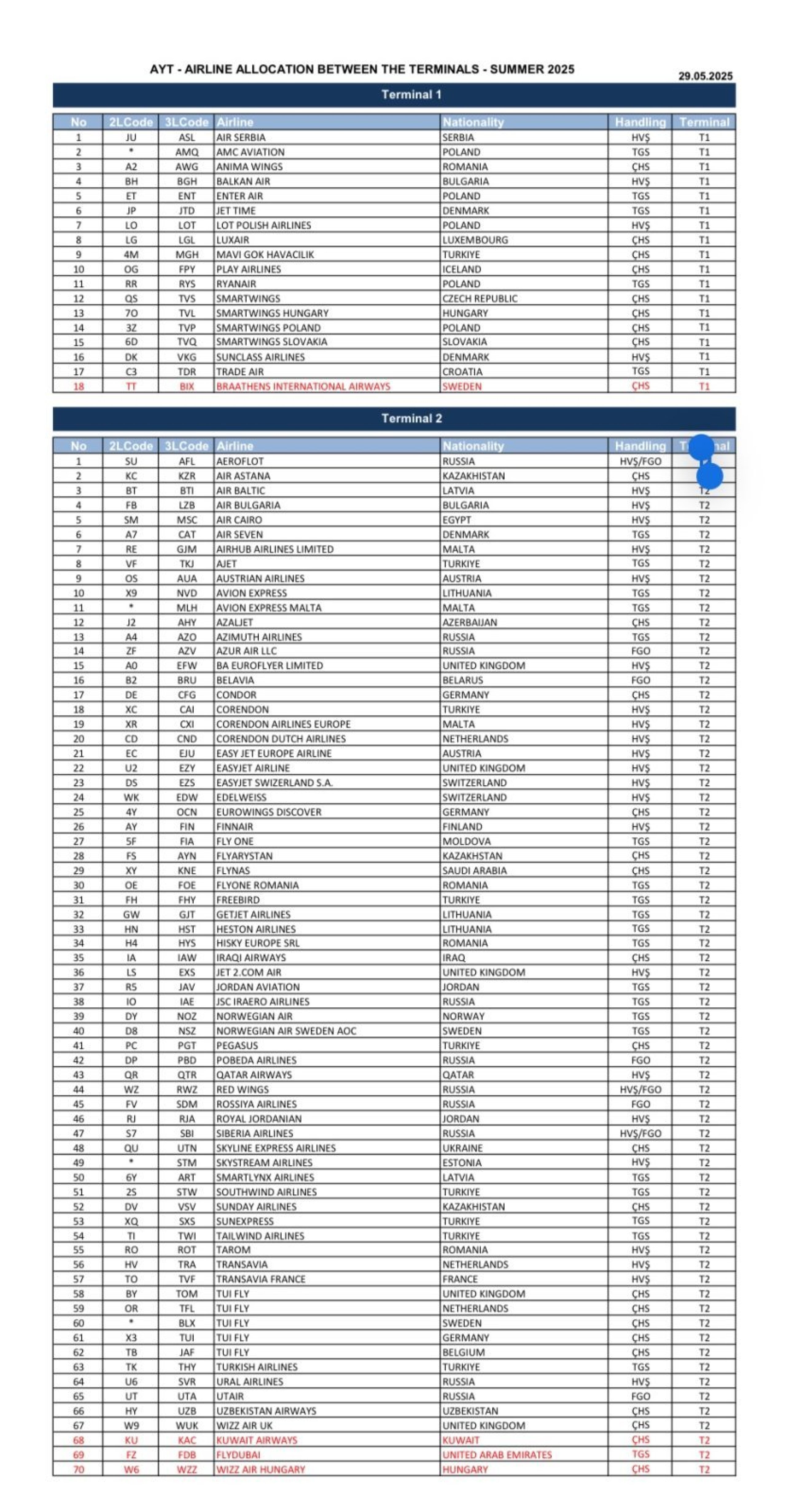 - Terminál 2 - Air Astana, airBaltic, Air Cairo, Bulgaria Air, AJet, Austrian, Avion Express, British Airways, Condor, Corendon Airlines, easyJet, Edelweiss Air, Eurowings, Finnair, FlyOne, Fly Arystan, Flydubai, Flynas, Freebird Airlines, GetJet Airlines, Heston Airlines, Hisky, Iraqi Airways, Jet2.com, Jordan Aviation, Kuwait Airways, Norwegian, Pegasus Airlines, Qatar Airways, Royal Jordanian, Skyline Express Airlines, Smartlynx Airlines, Southwind Airlines, Sunday Airlines, SunExpress, Tailwind Airlines, Tarom, Transavia, Tui Fly, Turkish Airlines, Uzbekistan Airways, Wizz Air
