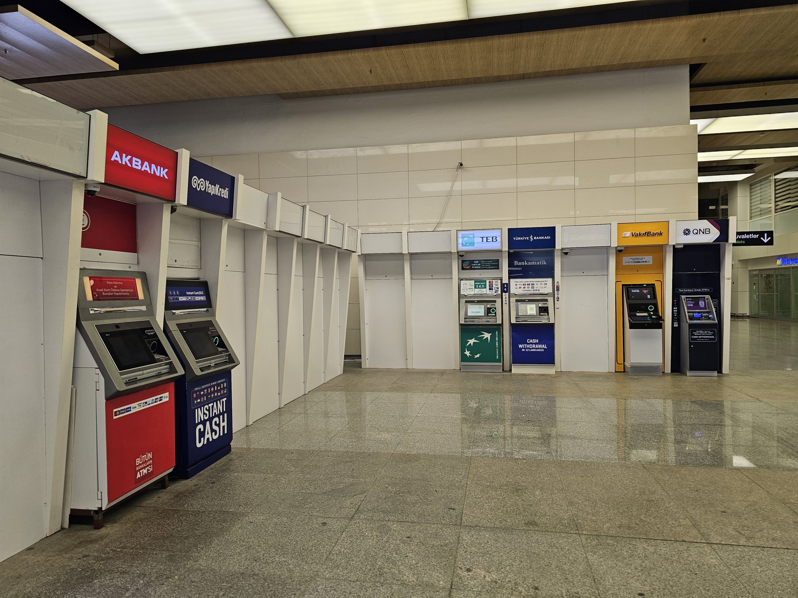 Bankomaty bežných tureckých bánk sa nachádzajú na mnohých miestach v príletových halách oboch terminálov.