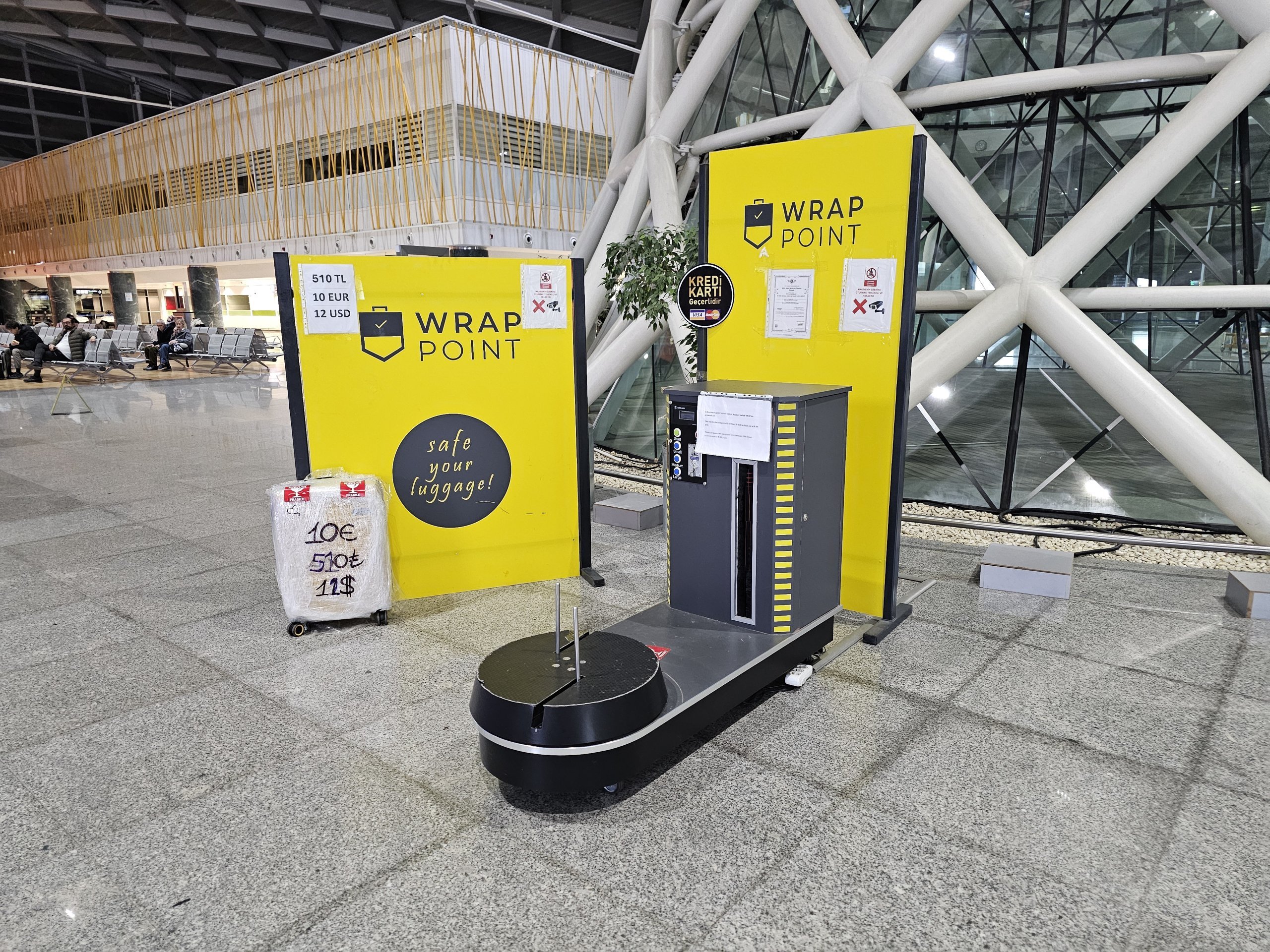 Odbavenú batožinu si môžete nechať zabaliť do ochrannej fólie v kiosku pri odbavovacích pultoch.