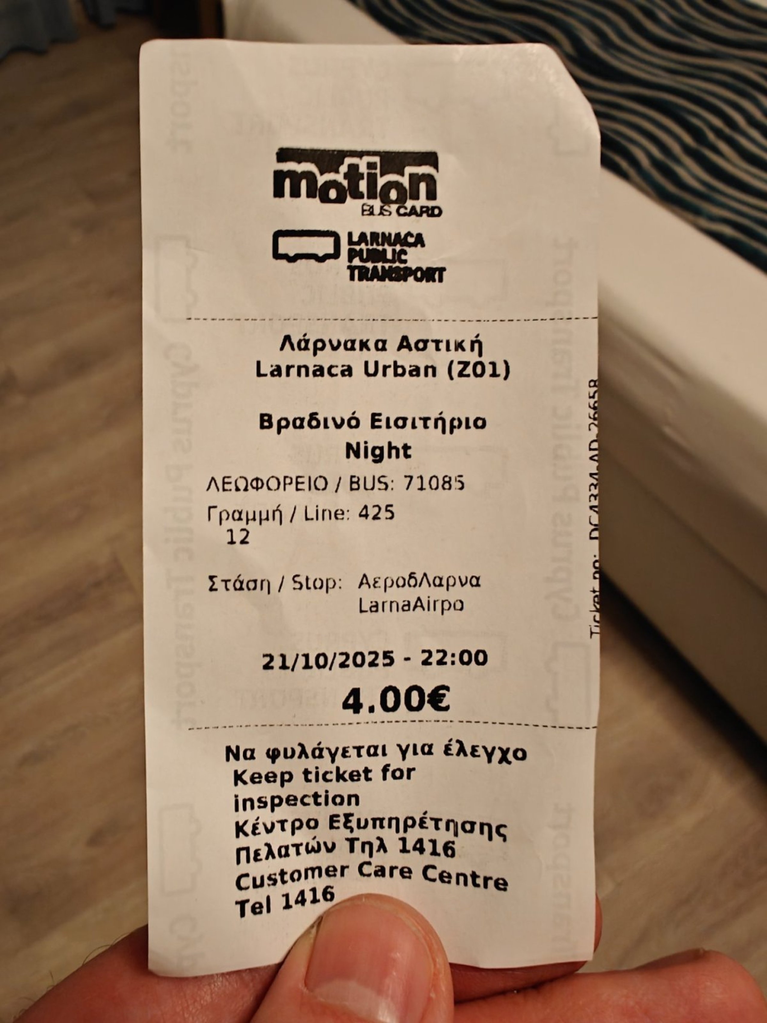 - 2,40 eur - 1 jazda kdekoľvek v mestskej hromadnej doprave v Larnake (neprestupný lístok)