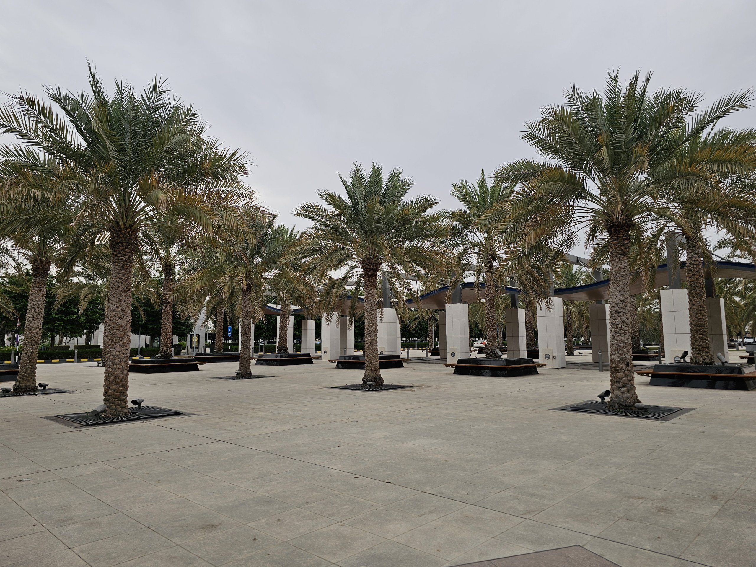 V suteréne pred terminálom si môžete oddýchnuť v pekne upravenom parku s množstvom palmových lavičiek a fontánou.