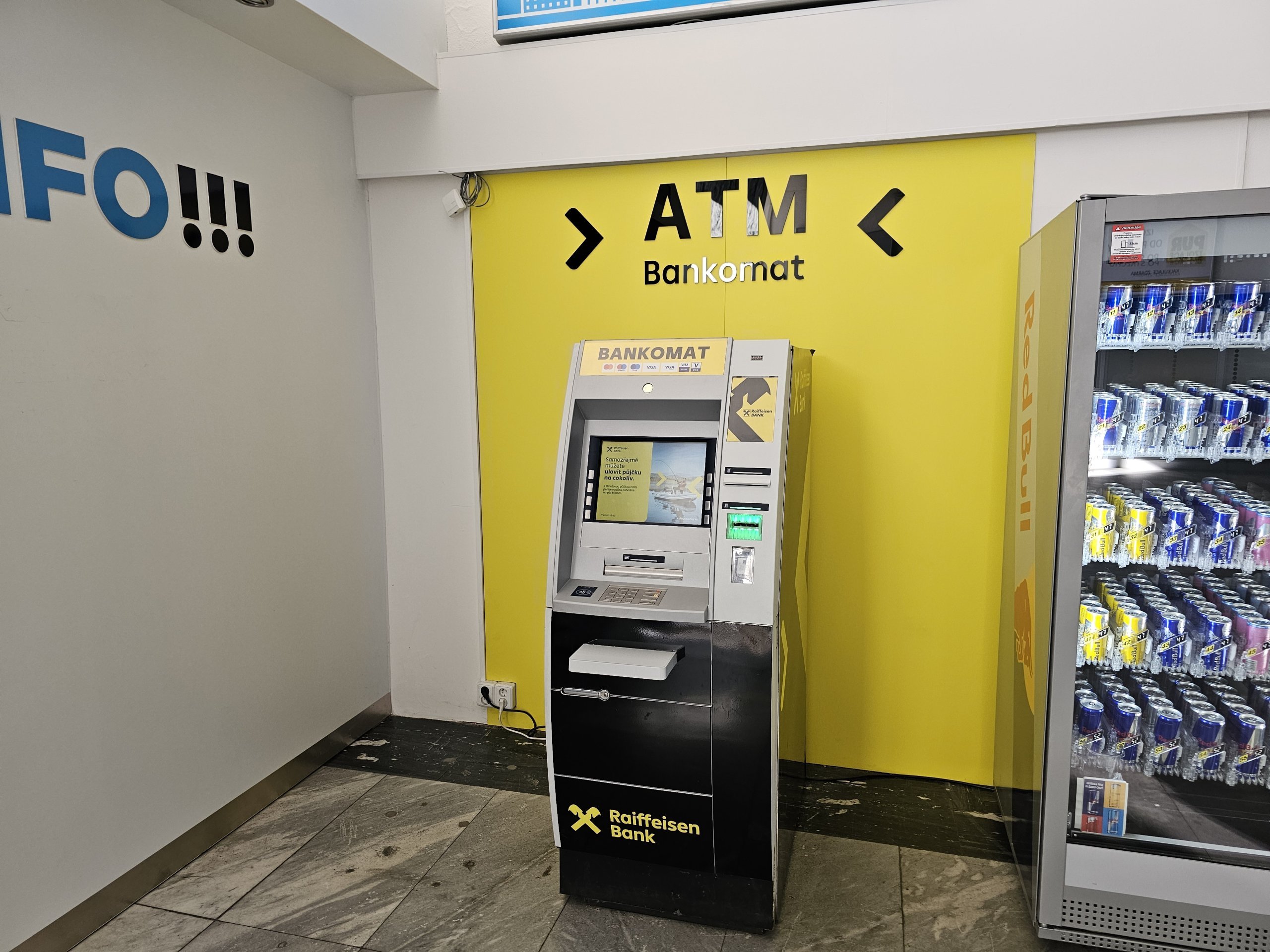 Môžete využiť bankomat Raiffeisenbank vo verejnej časti príletovej haly.