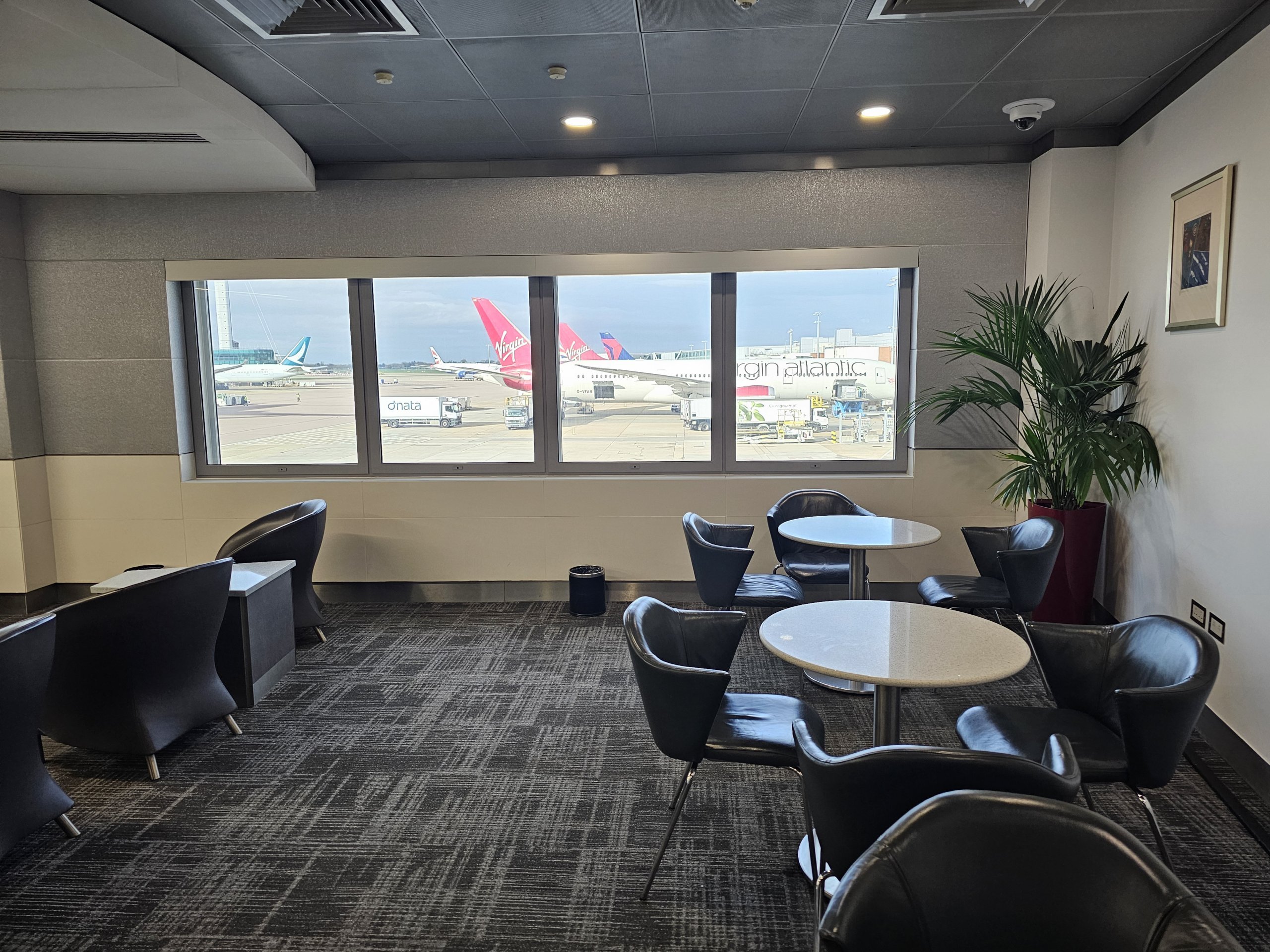 Veľkou výhodou je skvelý výhľad na letiskovú plochu - priamo pred salónikom sa nachádzajú stojiská veľkých diaľkových lietadiel a môžete odtiaľto vidieť aj ikonickú vežu letiska Heahtrow.