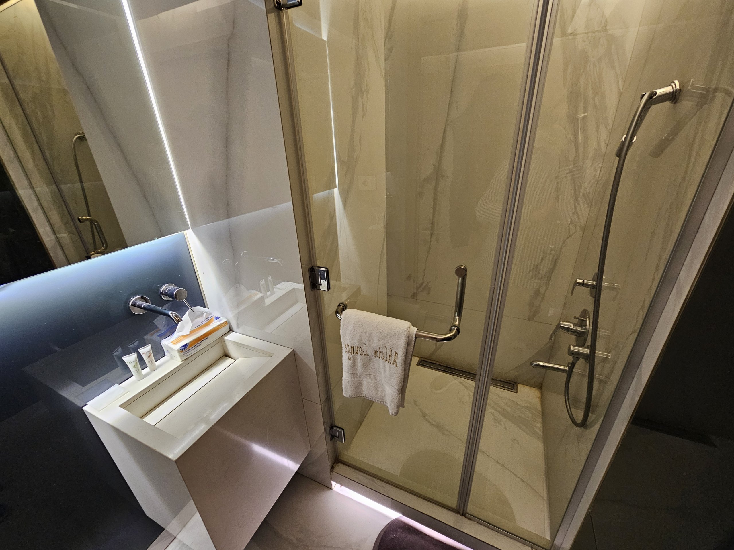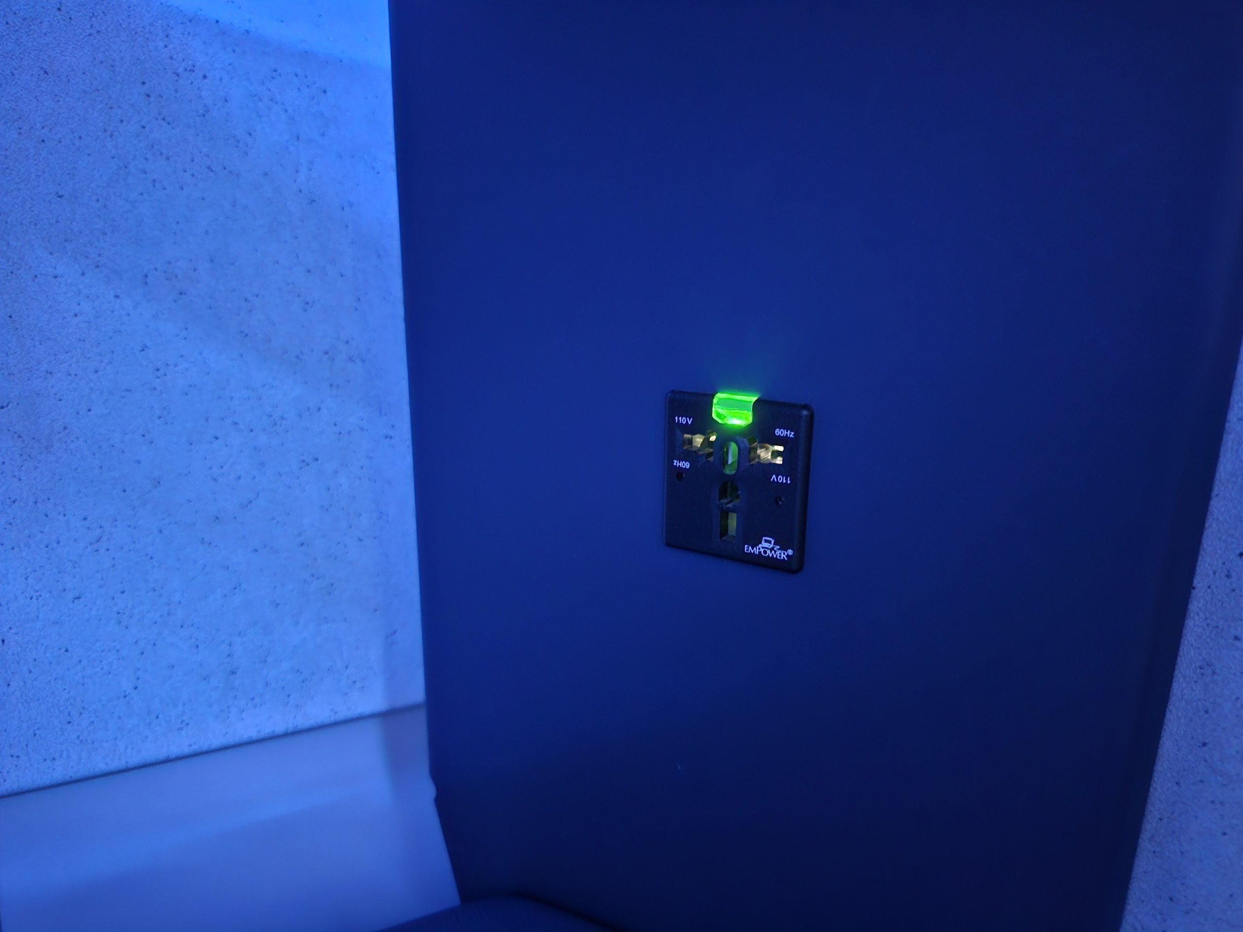 Elegantnú atmosféru podčiarkuje modré nočné osvetlenie, keďže náš let odlieta o 4:35 ráno.