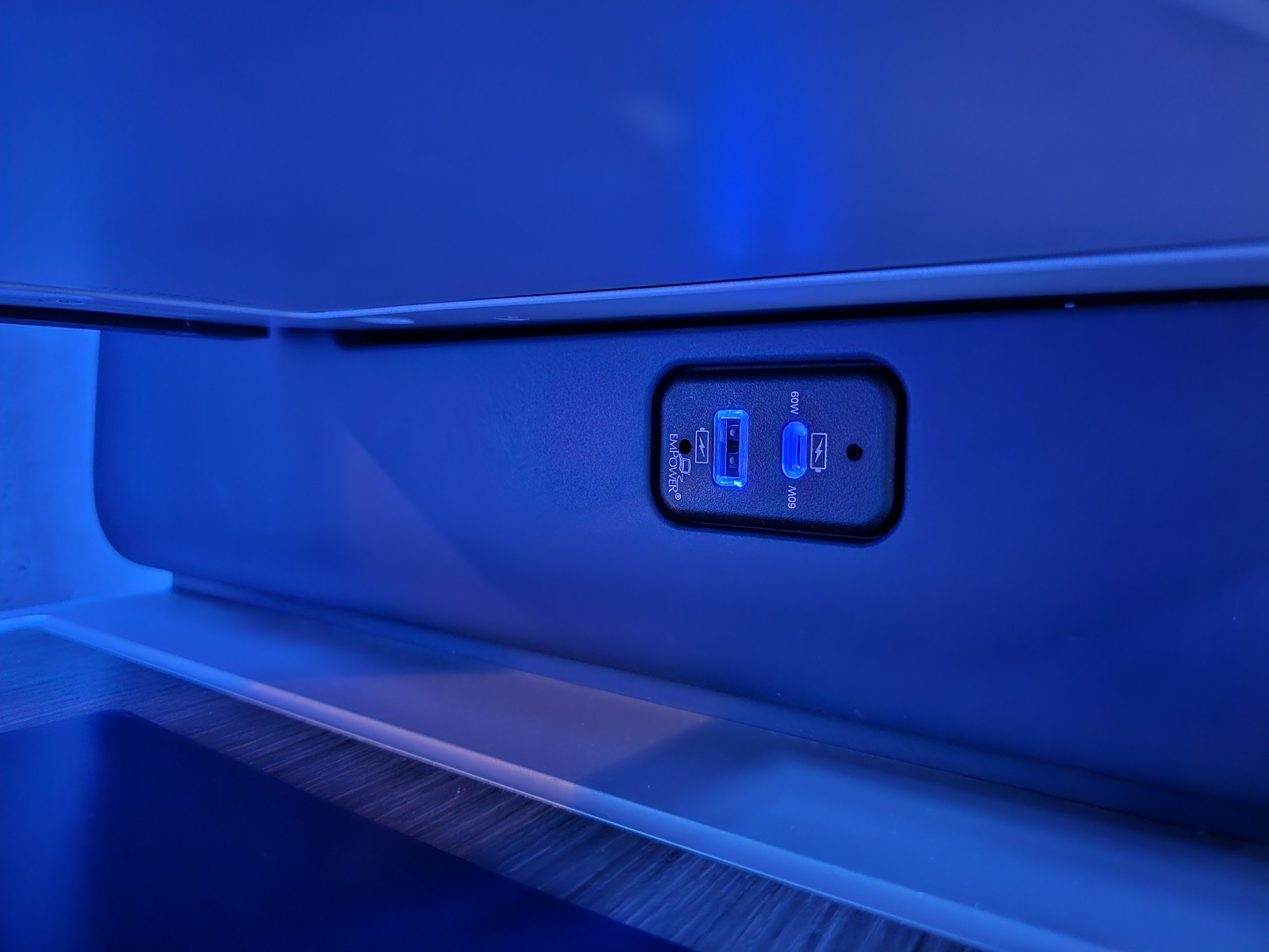 Sedadlo má porty USB-A aj USB-C, ako aj univerzálnu zásuvku na nabíjanie elektroniky.