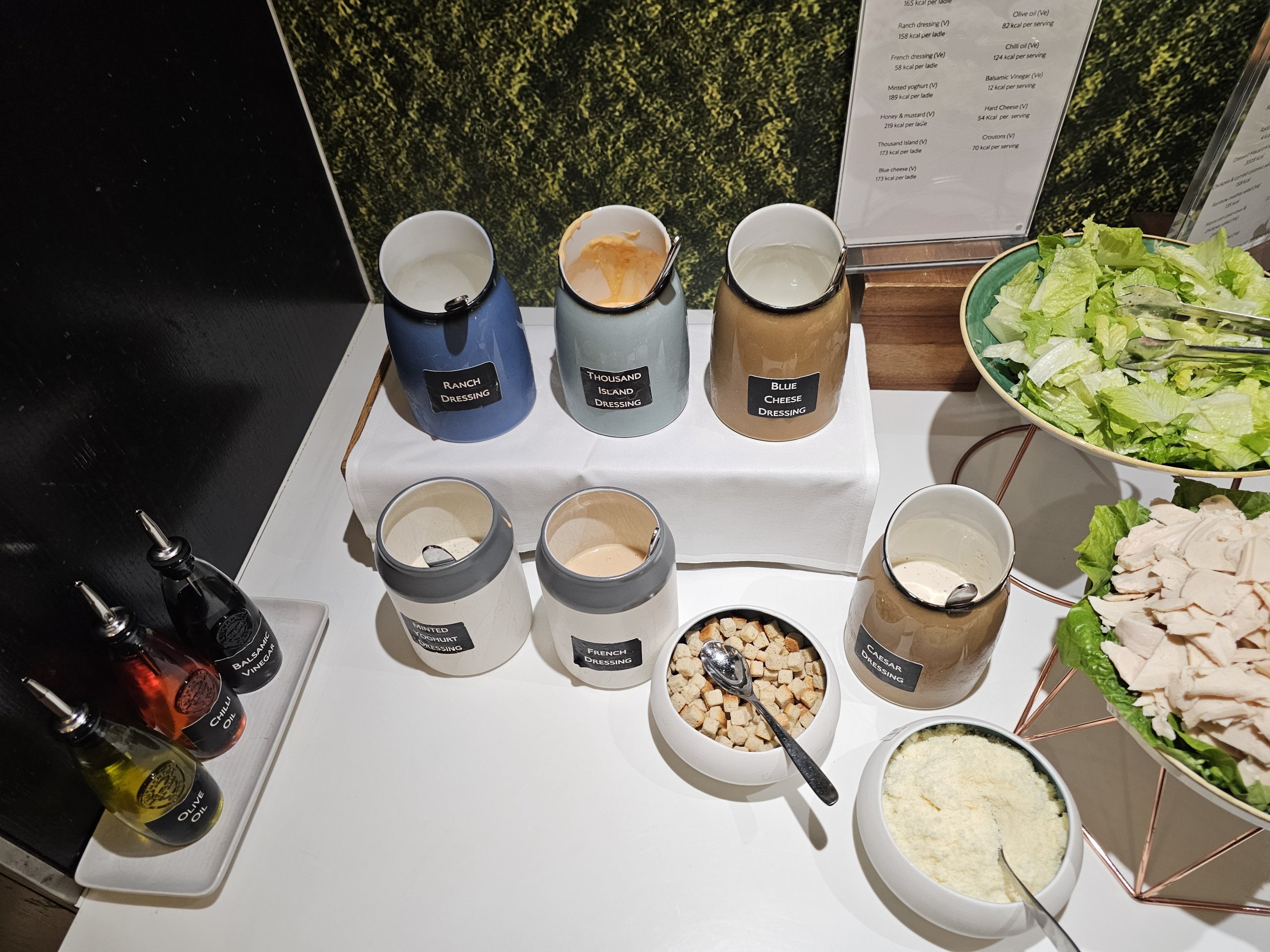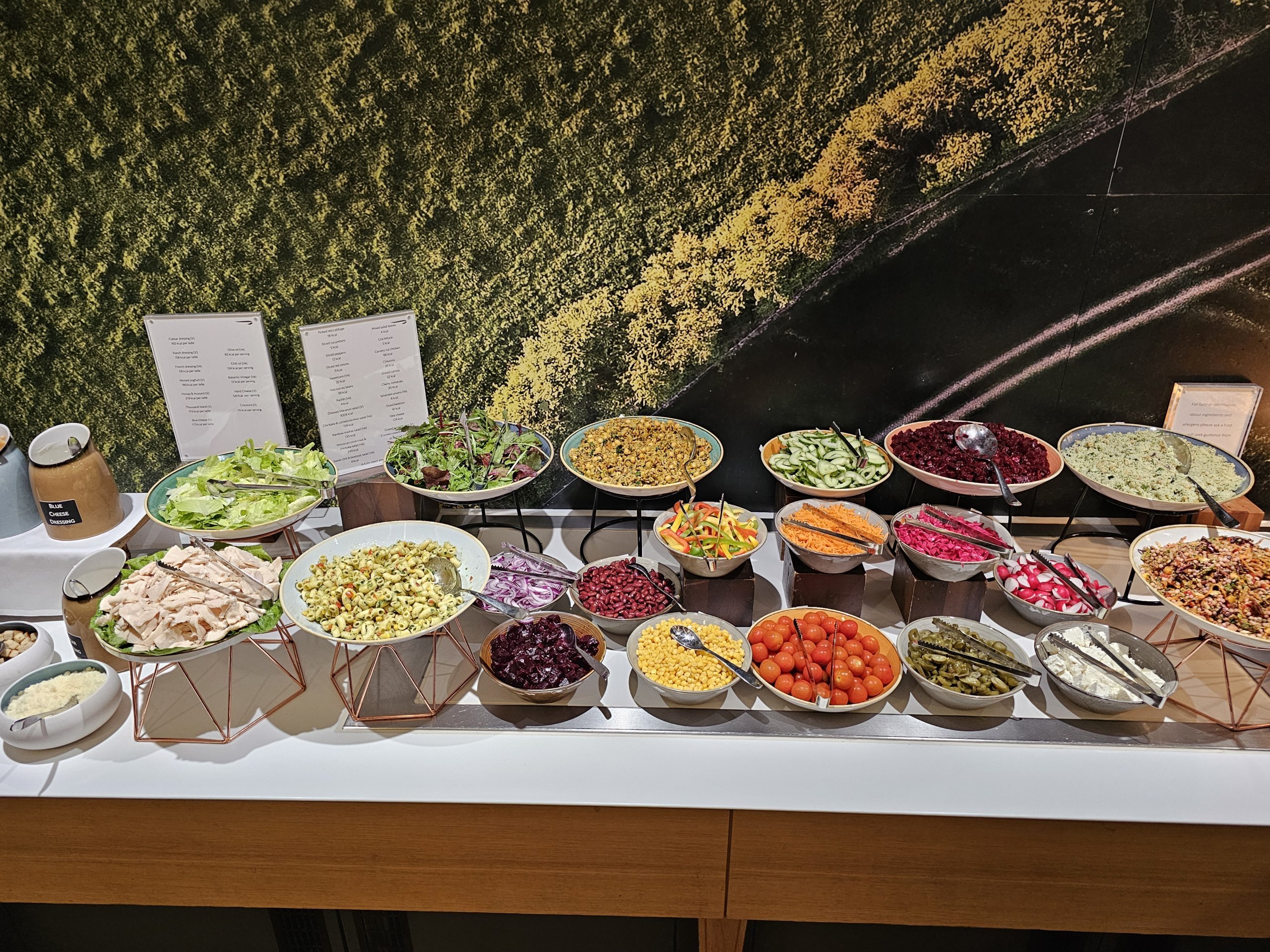 Ponuka studených jedál obsahuje niekoľko druhov zeleniny, šalát s výberom rôznych dresingov a veľmi obmedzený a slabý výber pečiva (prakticky len sladké).