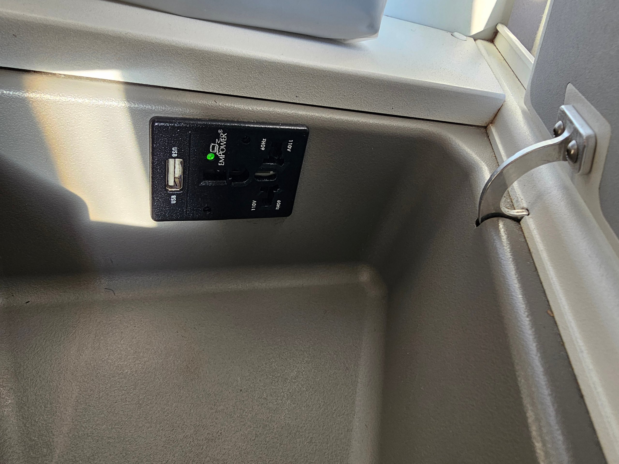 Ovládanie sedadla je jednoduché - prostredníctvom staršej, ale funkčnej dotykovej obrazovky na ľavej strane. K dispozícii je aj malá lampa na čítanie a univerzálna elektrická zásuvka s portom USB-A.