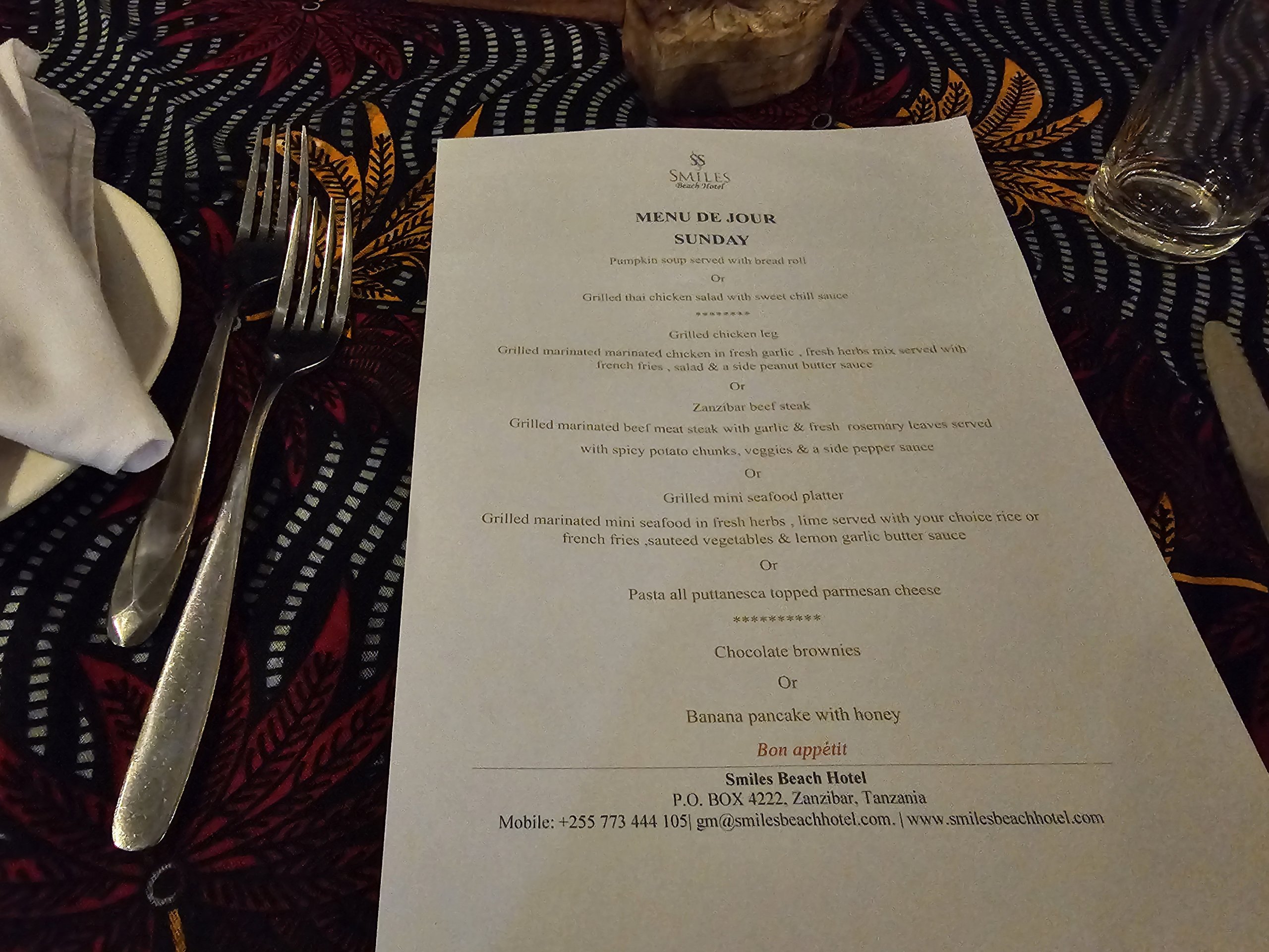 Na prvý pohľad je menu veľmi chudobné, ale v porovnaní s inými hotelmi rovnakej kategórie na Zanzibare, ako je napríklad Sea View Lodge v Jambiani, kam som sa presťahoval z Nungwi, je vlastne nadpriemerné.