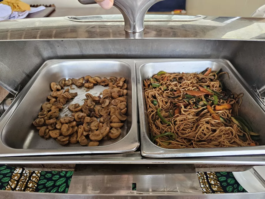 Na výber sú tri druhy teplých jedál - väčšinou rezance alebo ryža, veľmi nekvalitné klobásy, placky čapati alebo iné miestne pečivo, varená zelenina, fazuľa alebo huby.