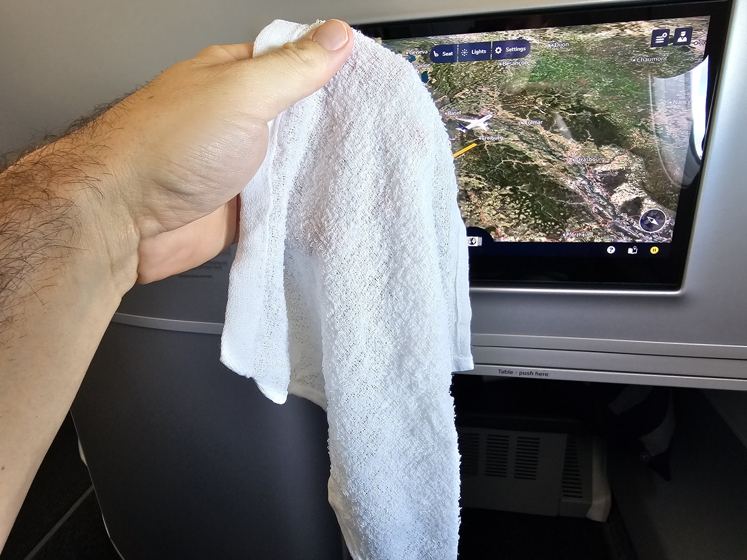 Hlavný chod prichádza asi hodinu po štarte. Pred jedlom dostávame tradičný horúci mokrý obrúsok, ktorý sa rozdáva ešte raz pred pristátím.