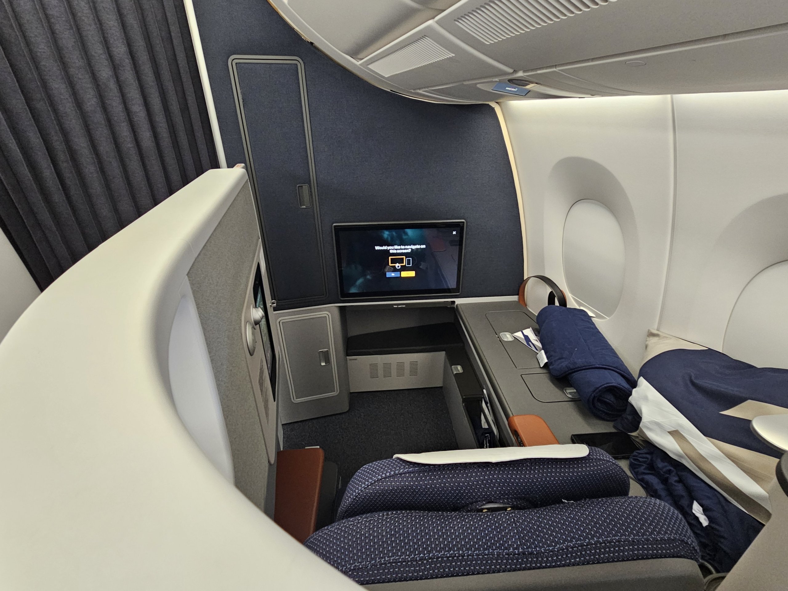 Letíme lietadlom Airbus A350-900, ktoré je staré len niekoľko mesiacov, a kabína biznis triedy vyzerá na prvý pohľad nová a moderná.